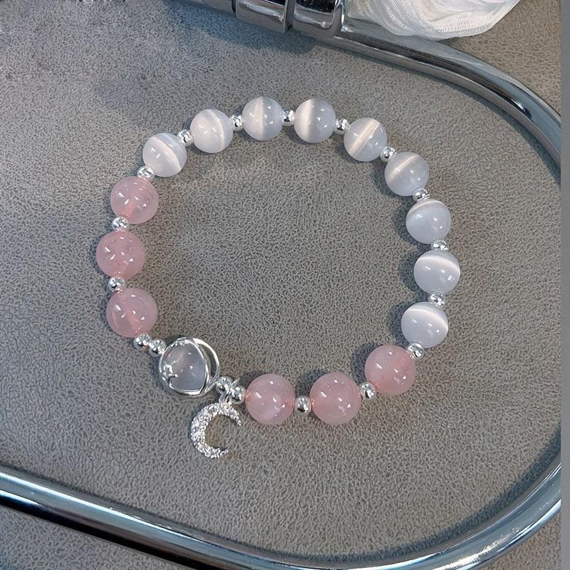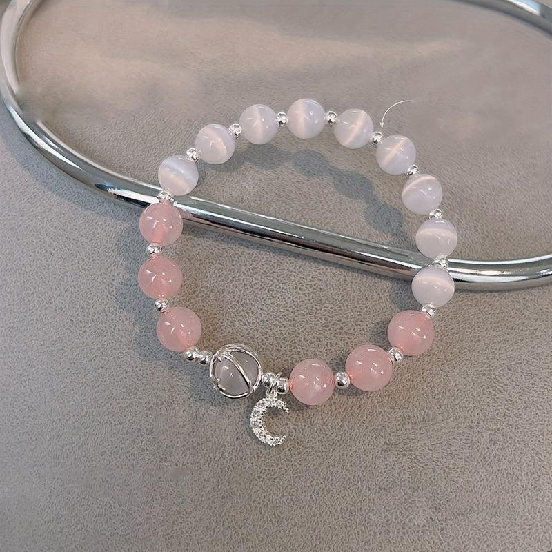 This boho bracelet features natural rose quartz and cat's eye beads with a silver plated lucky charm. It's perfect for daily wear and makes a great gift for Valentine's Day.