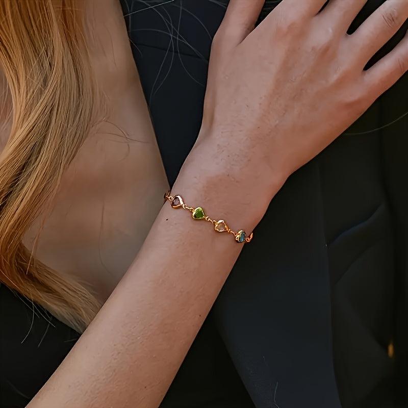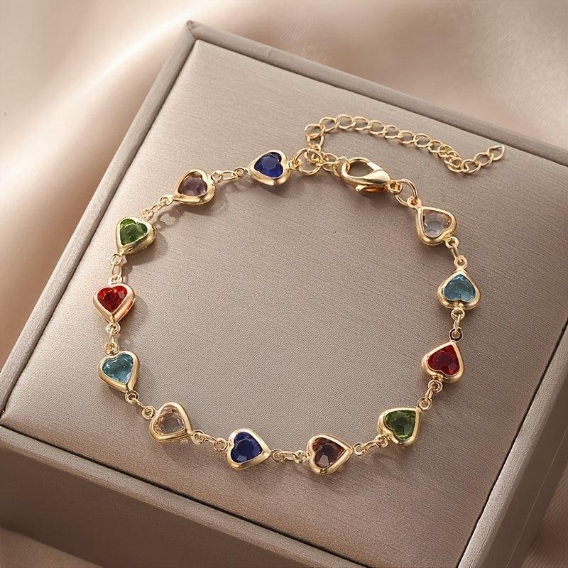 This eye-catching bracelet features a vintage Bohemian design with a colorful heart pendant and sparkling cube accents. Perfect for everyday wear or special occasions.