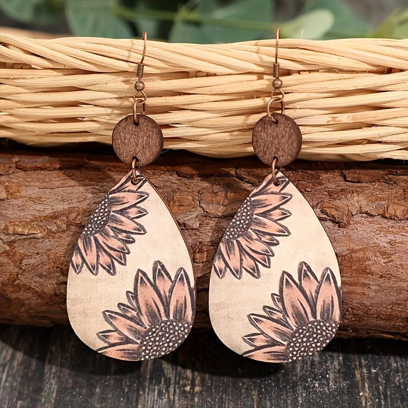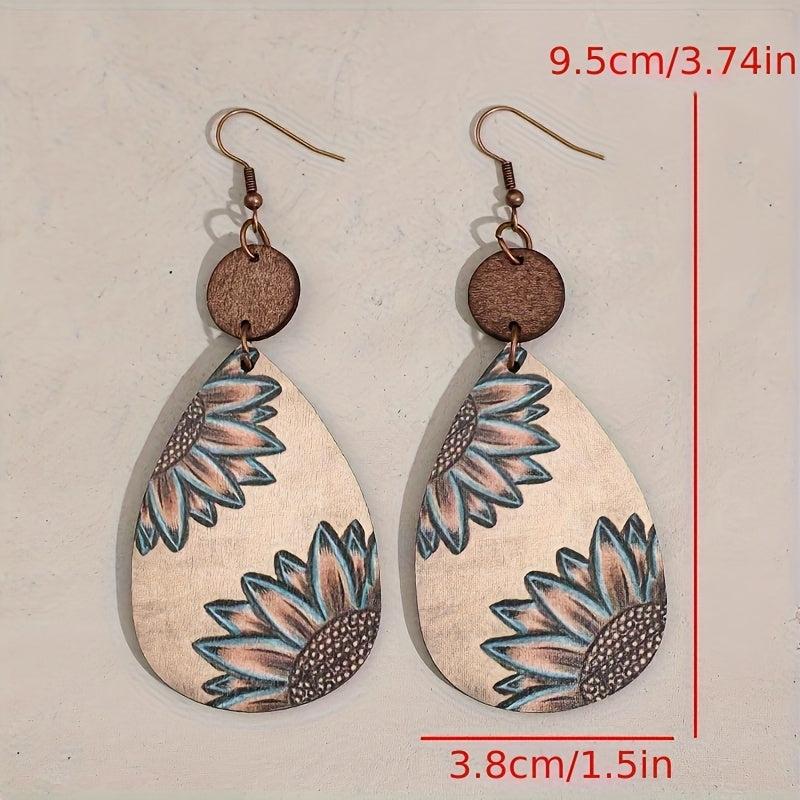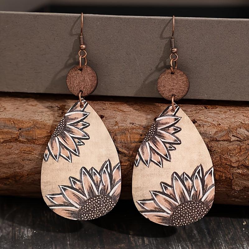 Add an elegant touch to your outfit with these bohemian sunflower teardrop earrings. Featuring a wooden print and vintage iron hooks, these earrings exude bohemian style and vintage charm.