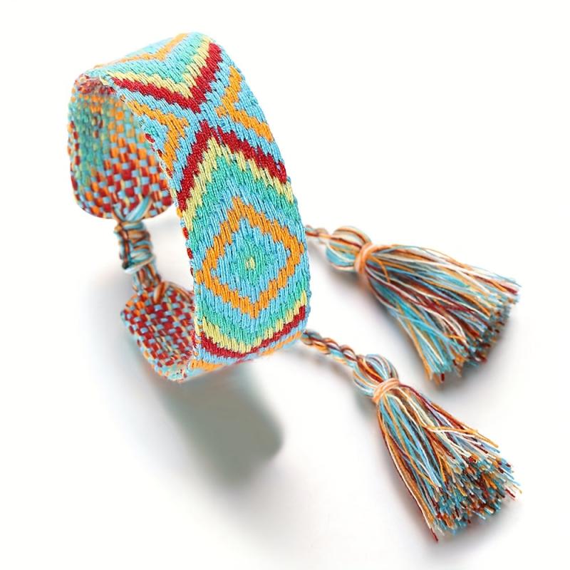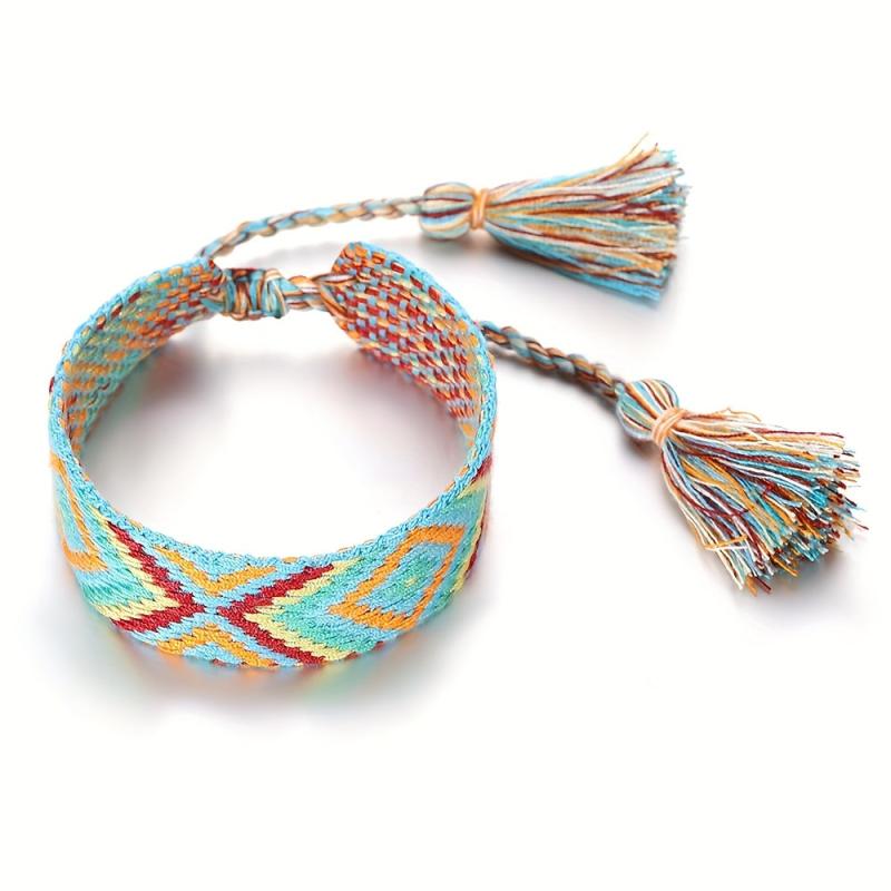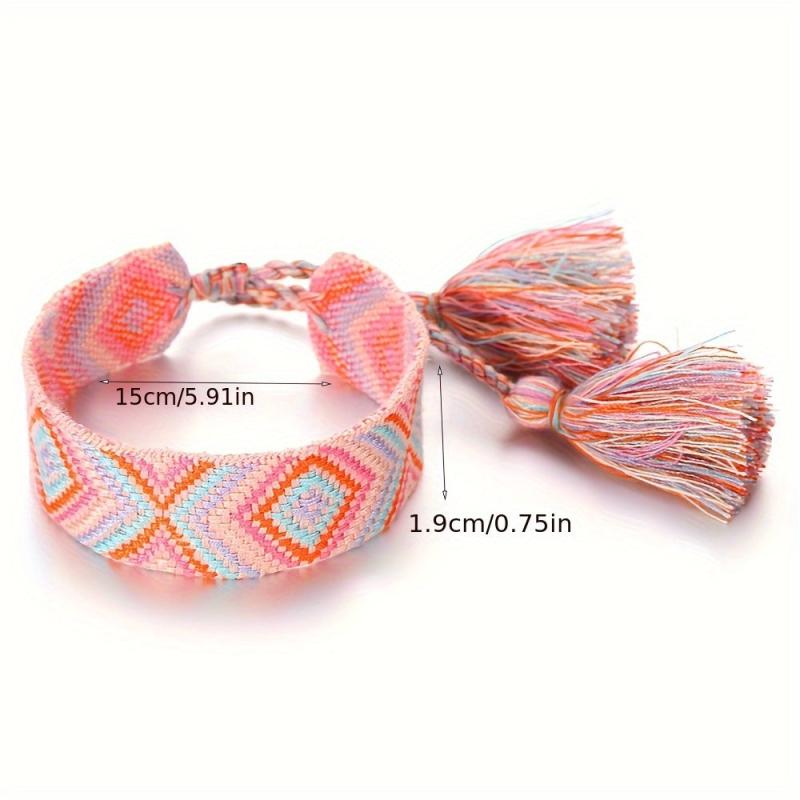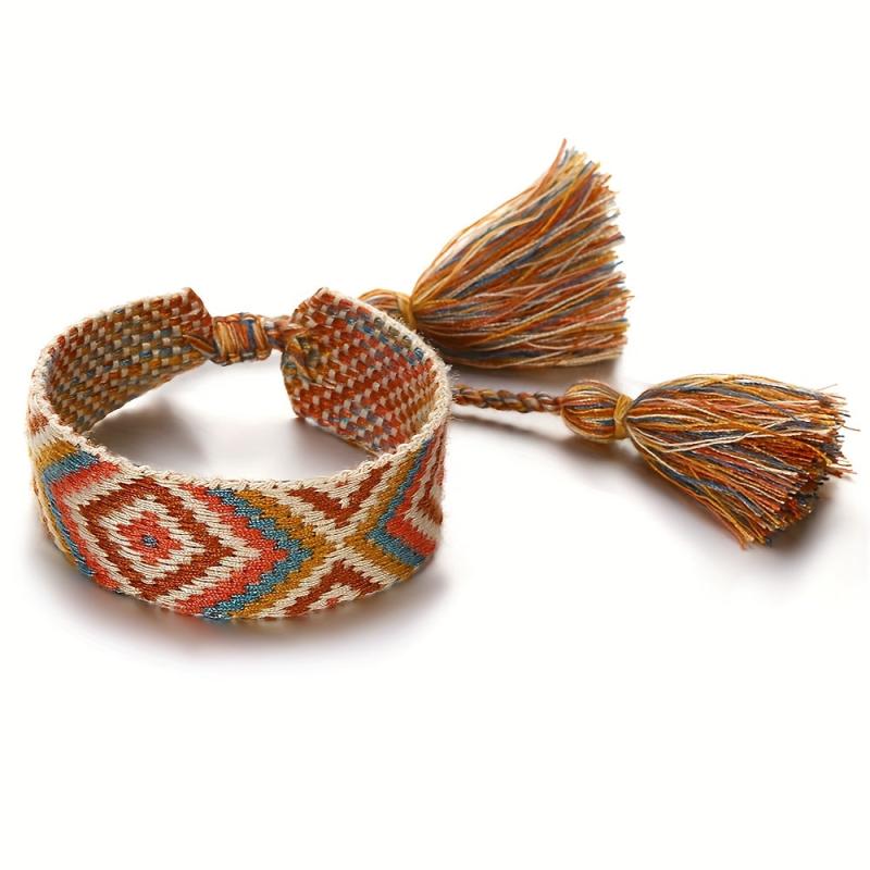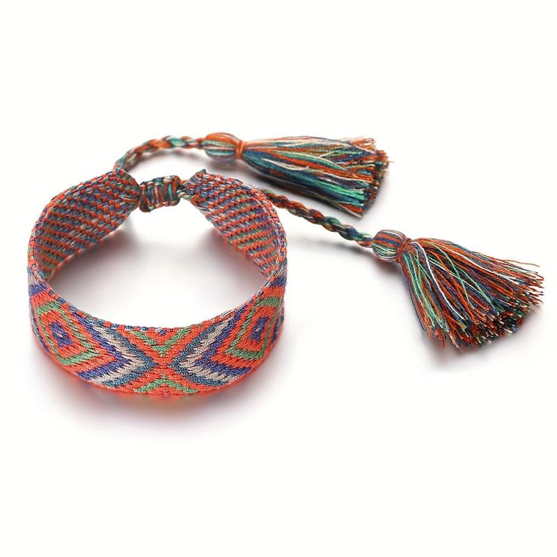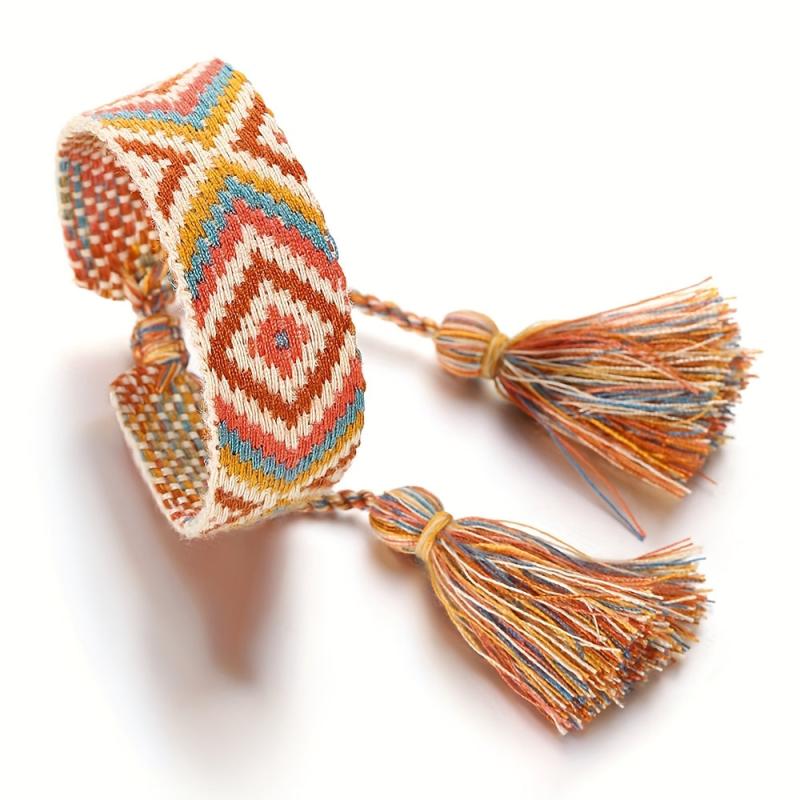 Add a touch of bohemian flair to your look with this adjustable tassel bracelet featuring an embroidered geometric design. Perfect for a relaxed and stylish accessory.
