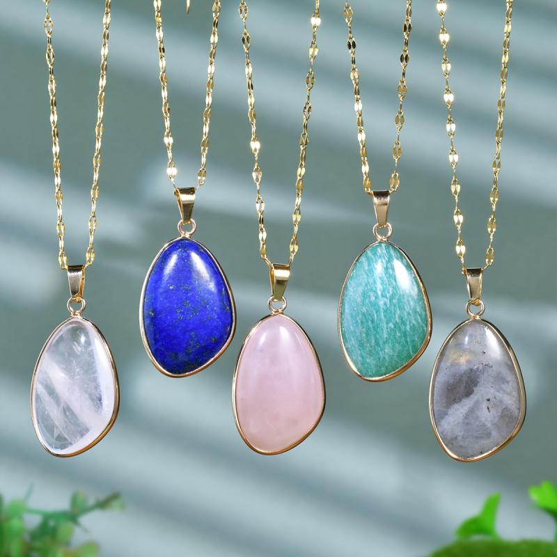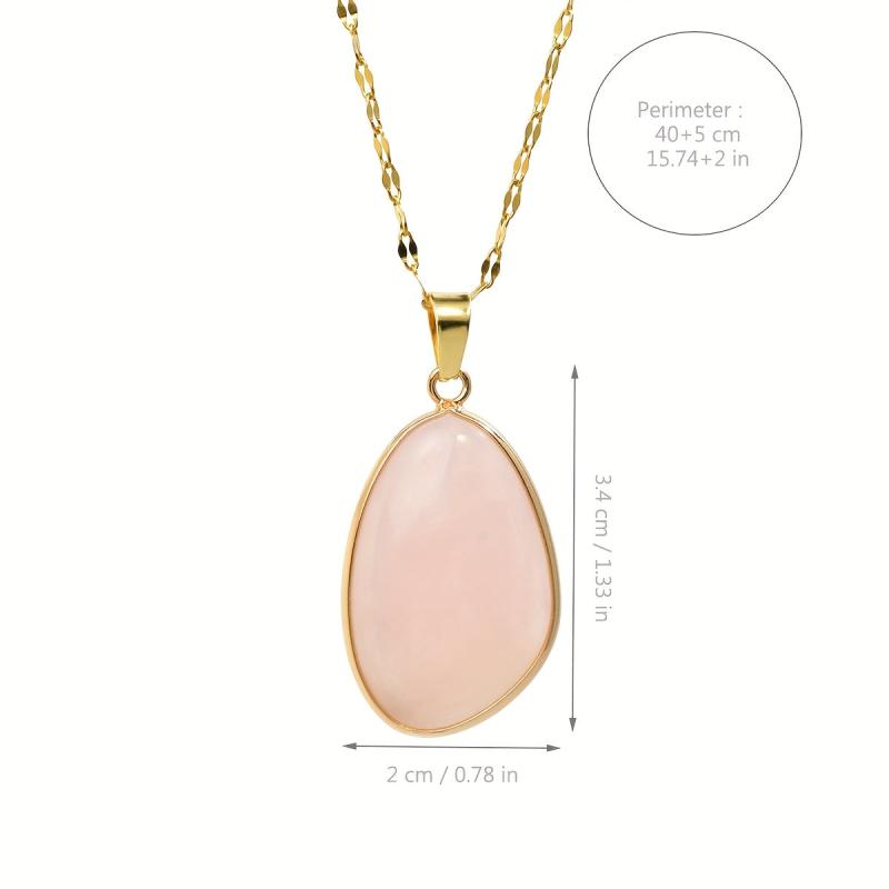 This elegant necklace features a bohemian teardrop pendant made of natural stone on a golden chain. Available in green or pink.