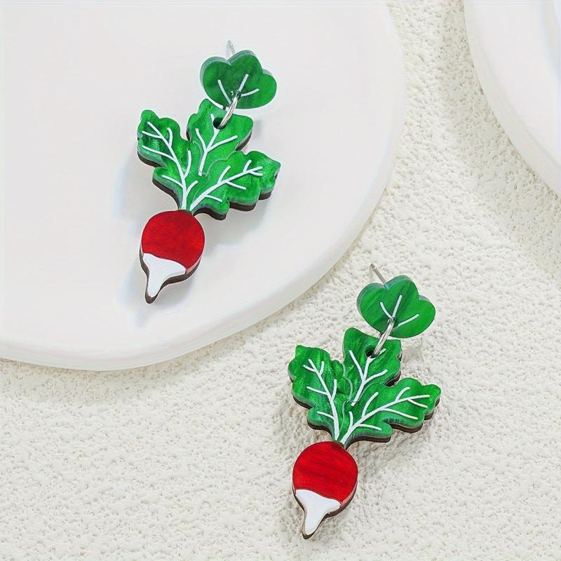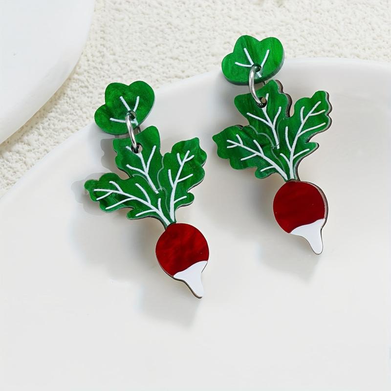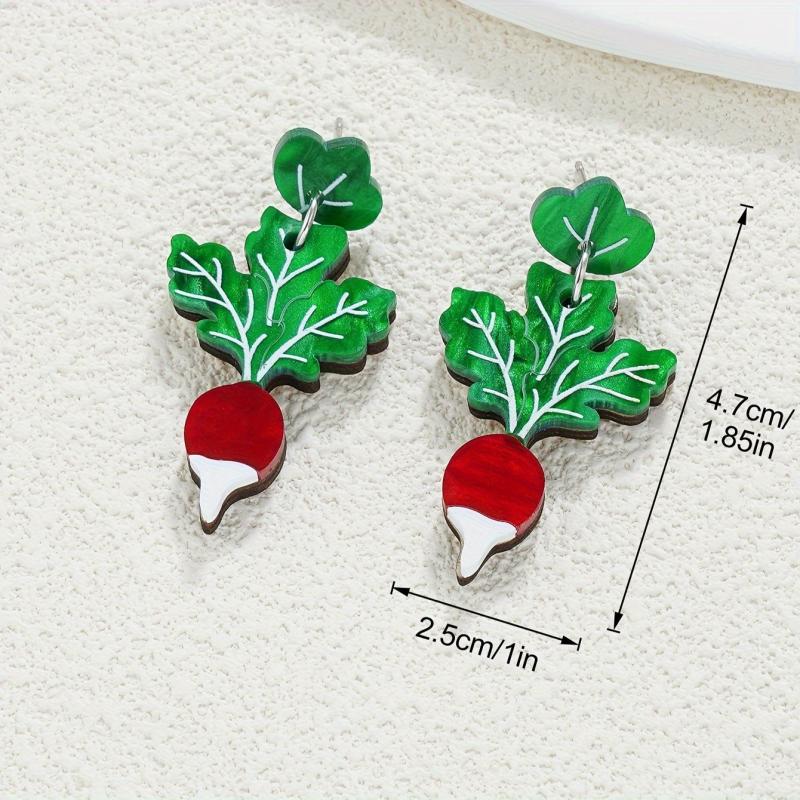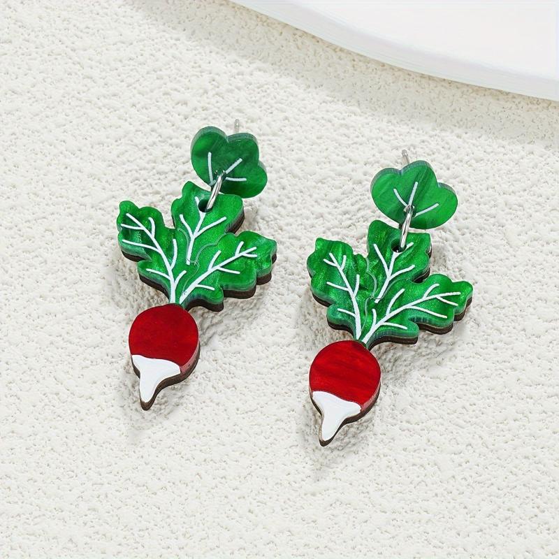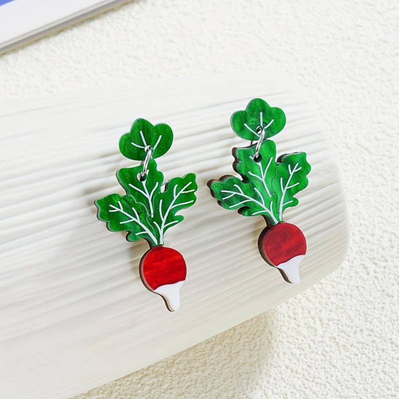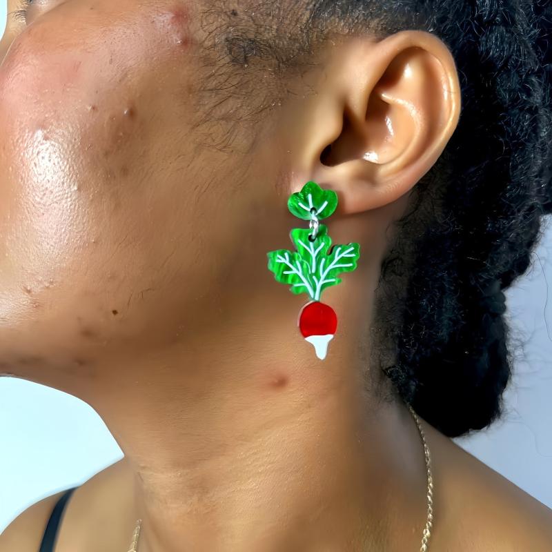 Add a playful touch to your look with these unique earrings featuring green chard leaves with red carrot tips. Crafted from wood and stainless steel posts, these earrings are perfect for everyday wear.