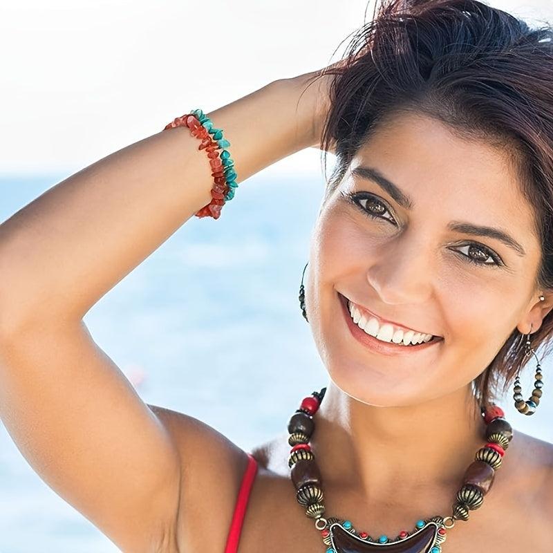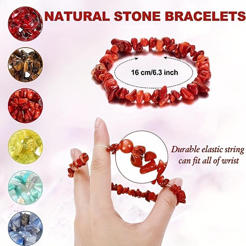 Elevate your everyday look with these natural crystal chakra bracelets. Perfect for daily wear, these stretch bracelets feature crystal chips in seven different chakra colors.