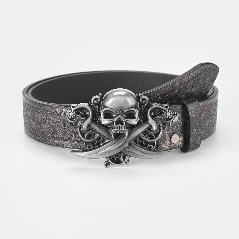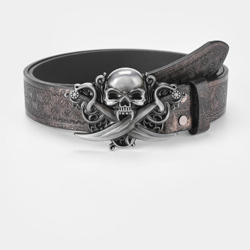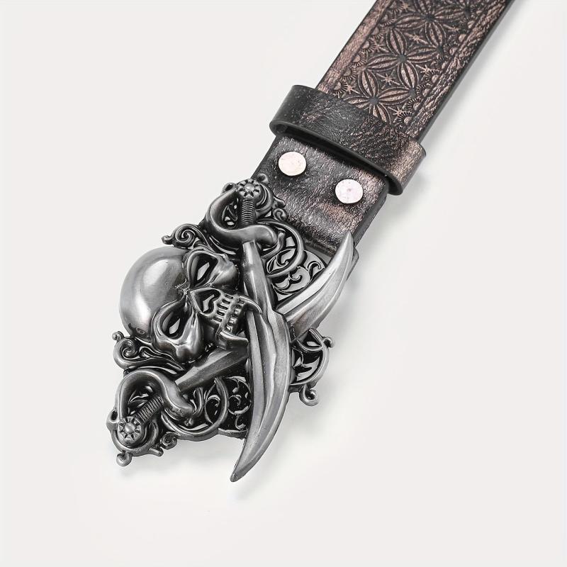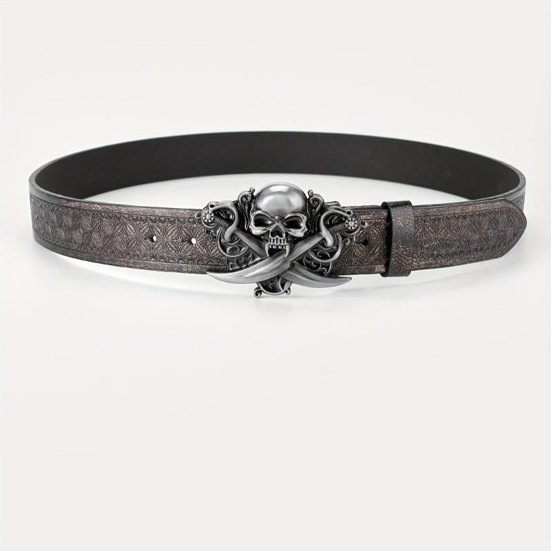 Elevate your style with this fashionable men's belt featuring an embossed PU strap and a unique alloy skull buckle. Hand washable and suitable for professional dry cleaning.