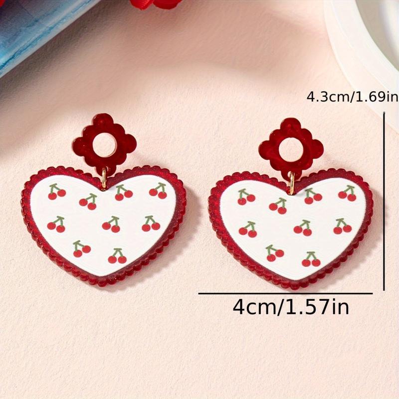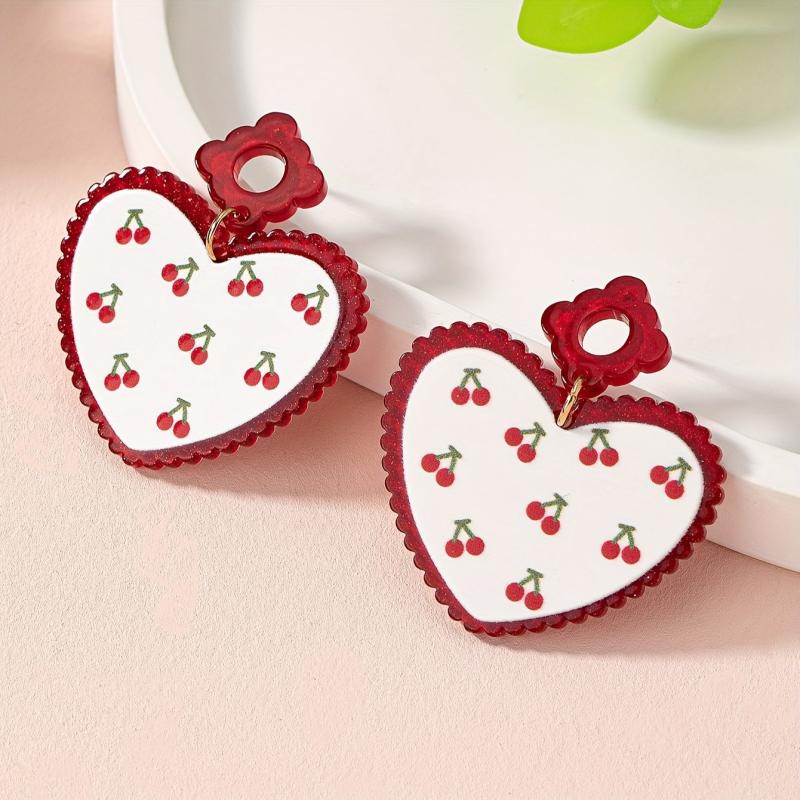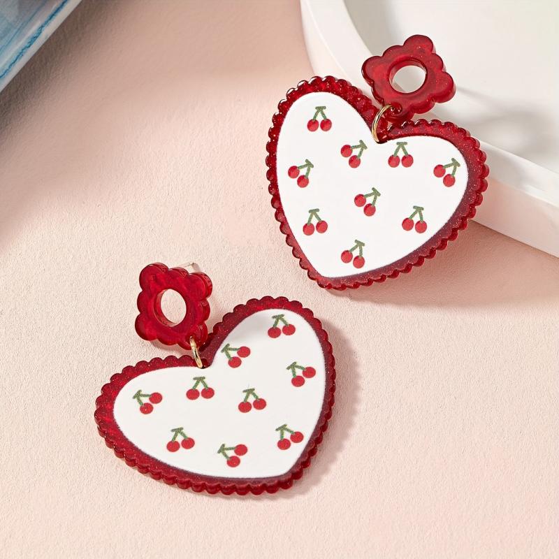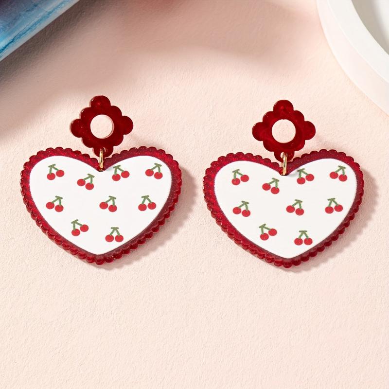 Make a statement with these eye-catching cherry heart acrylic earrings featuring a bold design in golden plated red color. Perfect for adding a pop of color to any outfit.
