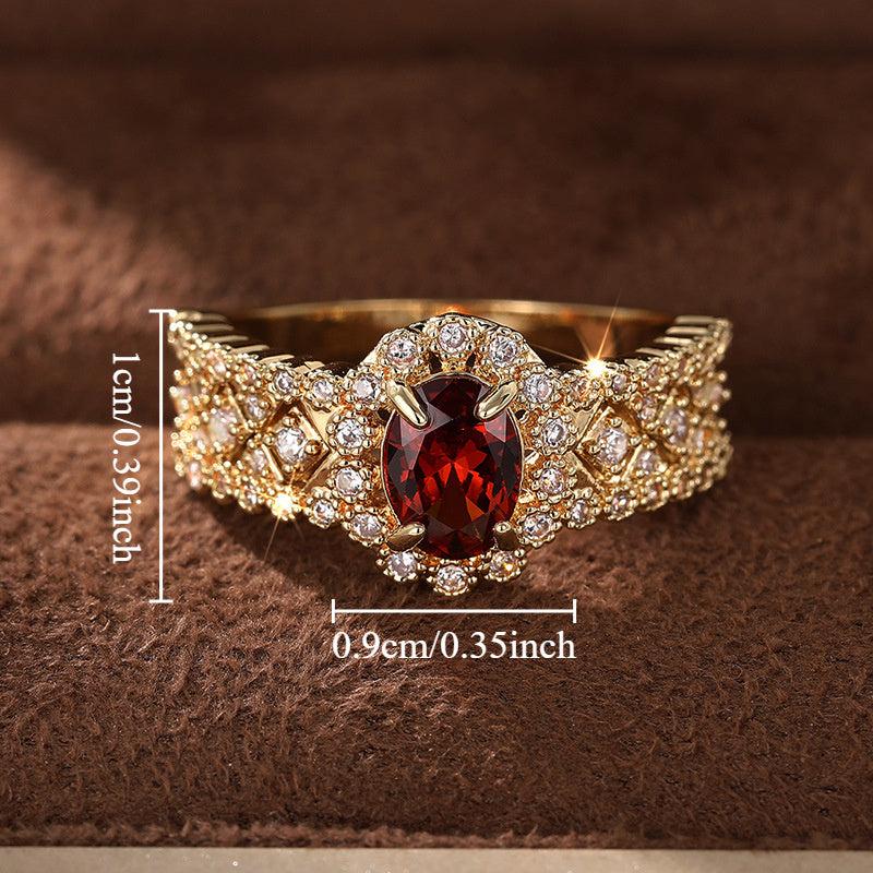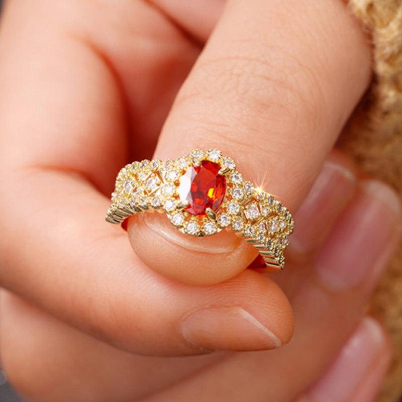 Add a touch of glamour to your party outfit with this stylish oval ring featuring a vibrant red synthetic zirconia inlay.