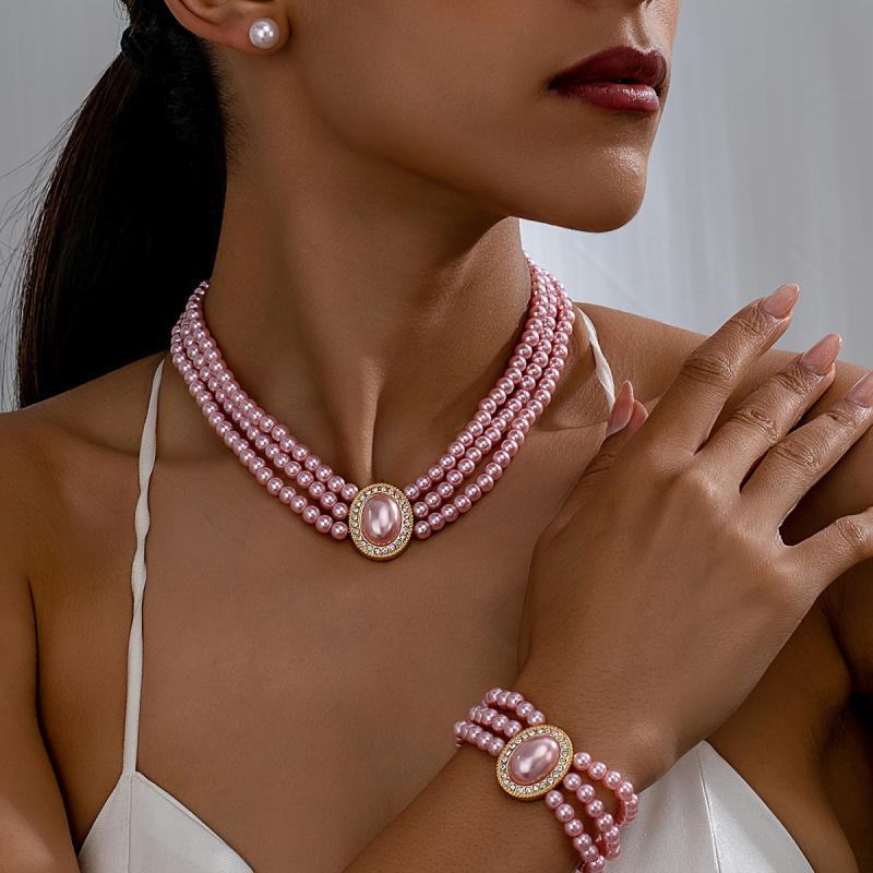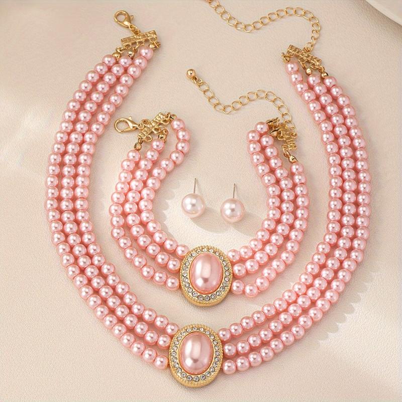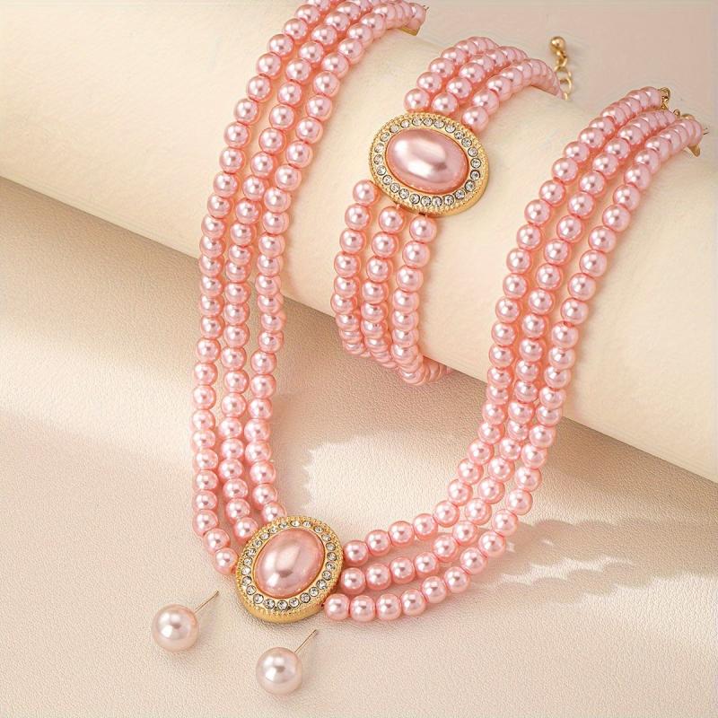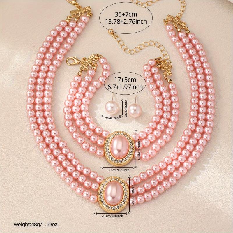 This fashionable set includes a light pink faux pearl beaded layer necklace, bracelet, and earrings. Made of high-quality alloy, it is perfect for daily wear and gift giving.