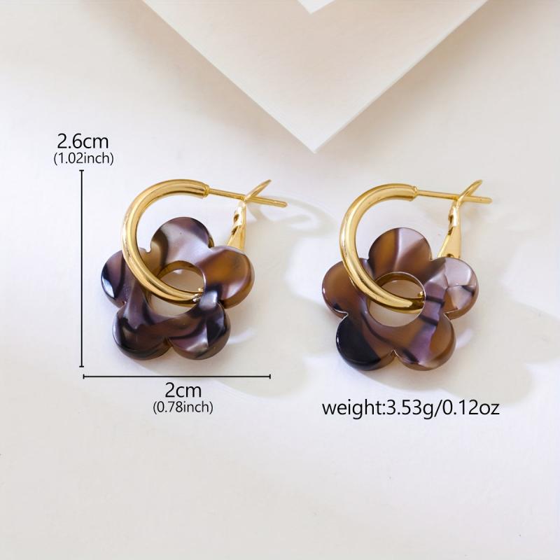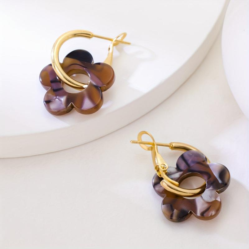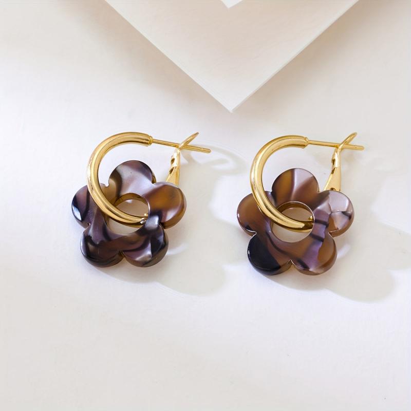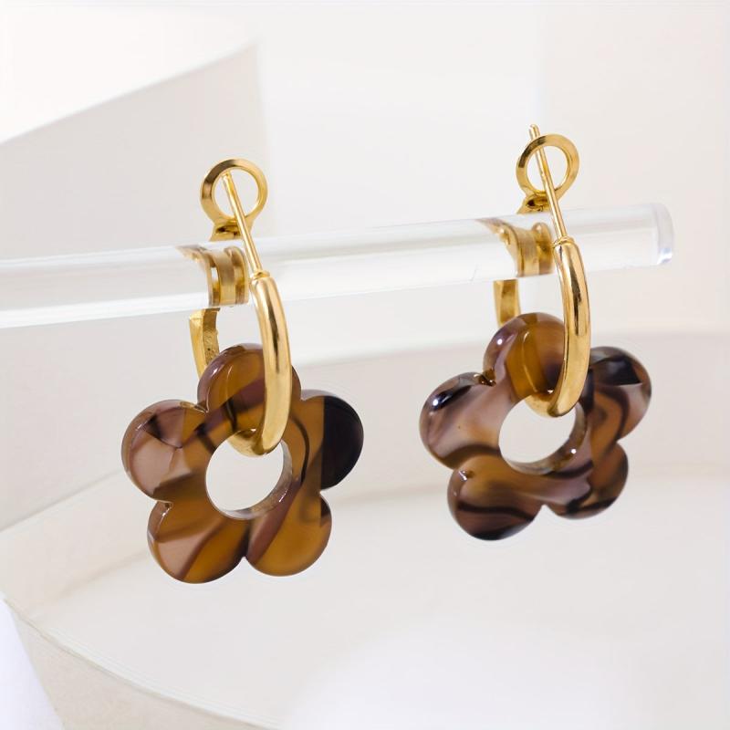 These stylish coffee-colored floral drop earrings feature 316 stainless steel posts and acrylic materials, making them hypoallergenic and perfect for daily wear or gifting.