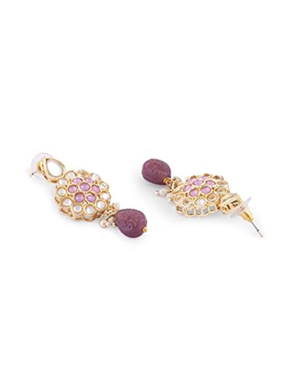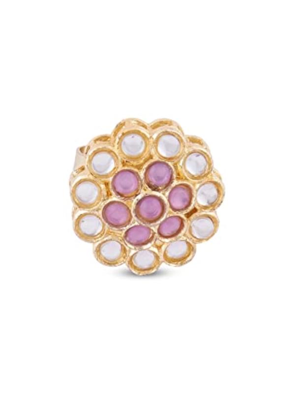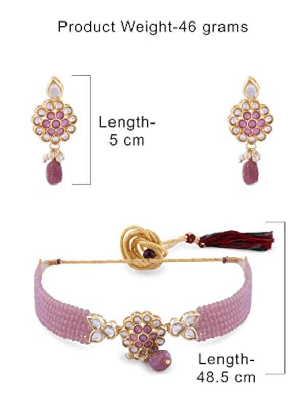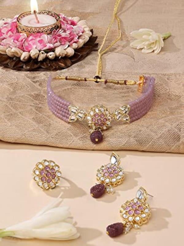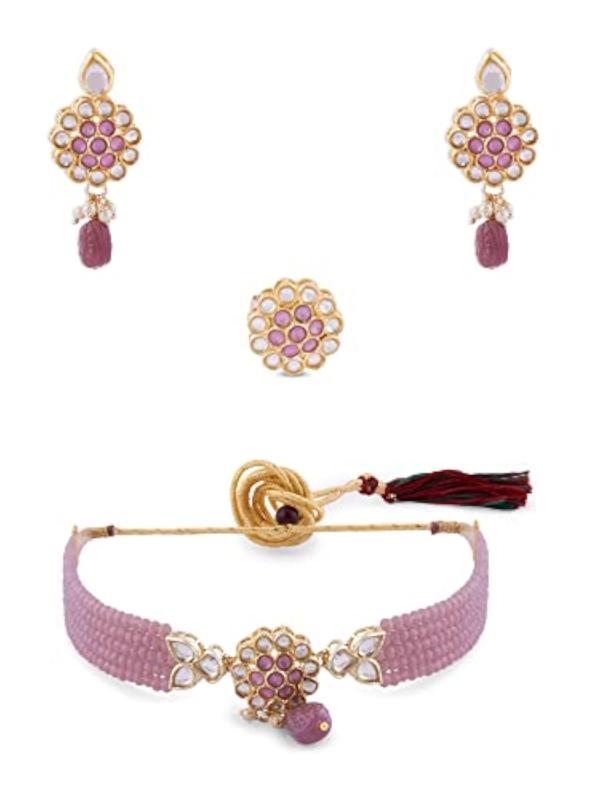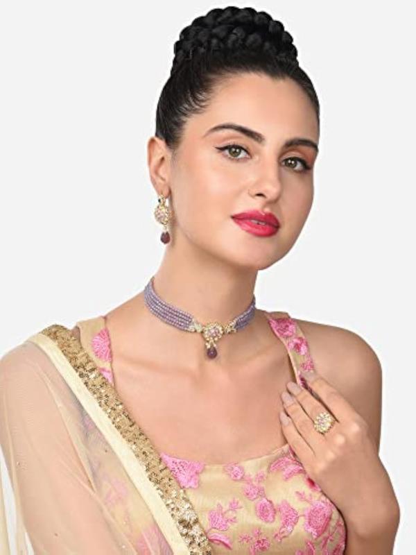 Elegant multistrand choker necklace featuring crystal beads and Kundan stones. This set includes a matching pair of earrings and a ring to complete your look.