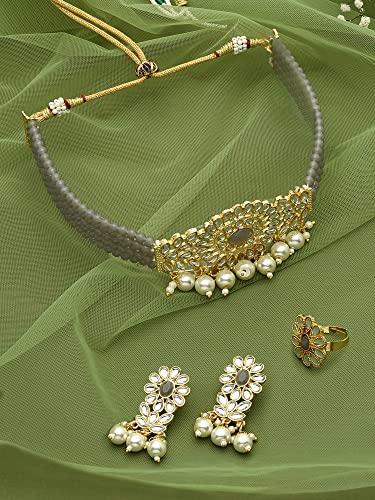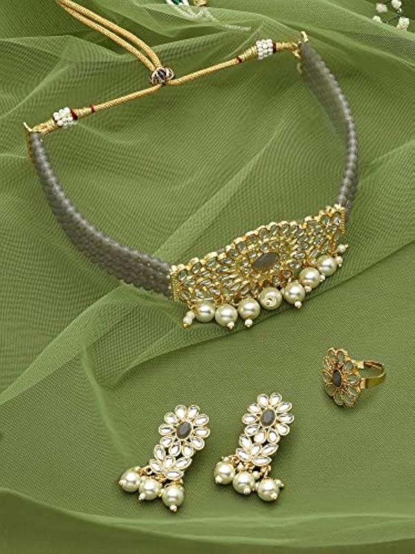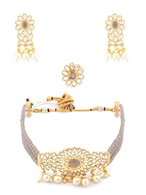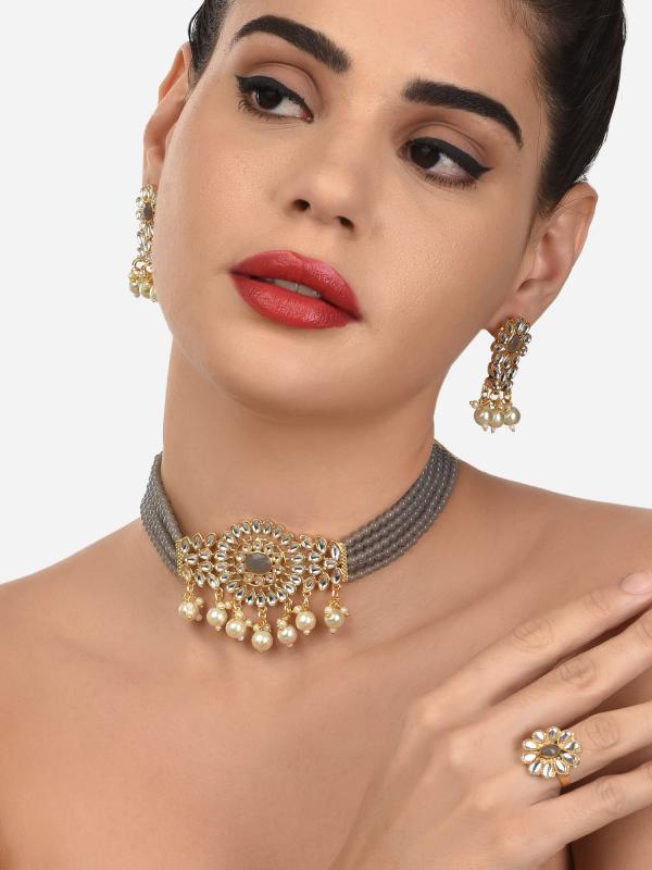 Enhance your style with this stunning crystal beaded multistrand Kundan choker necklace, earring, and ring set. Perfect for women who love elegant jewelry.