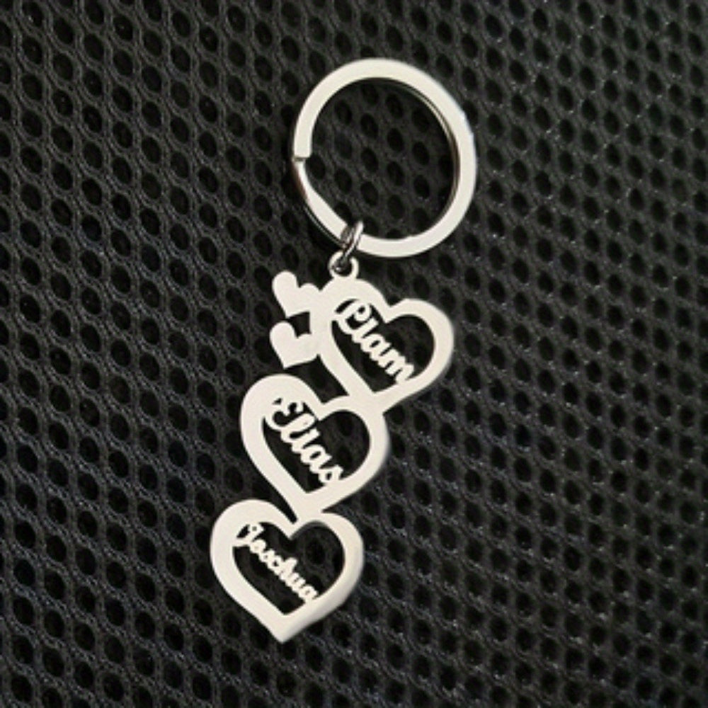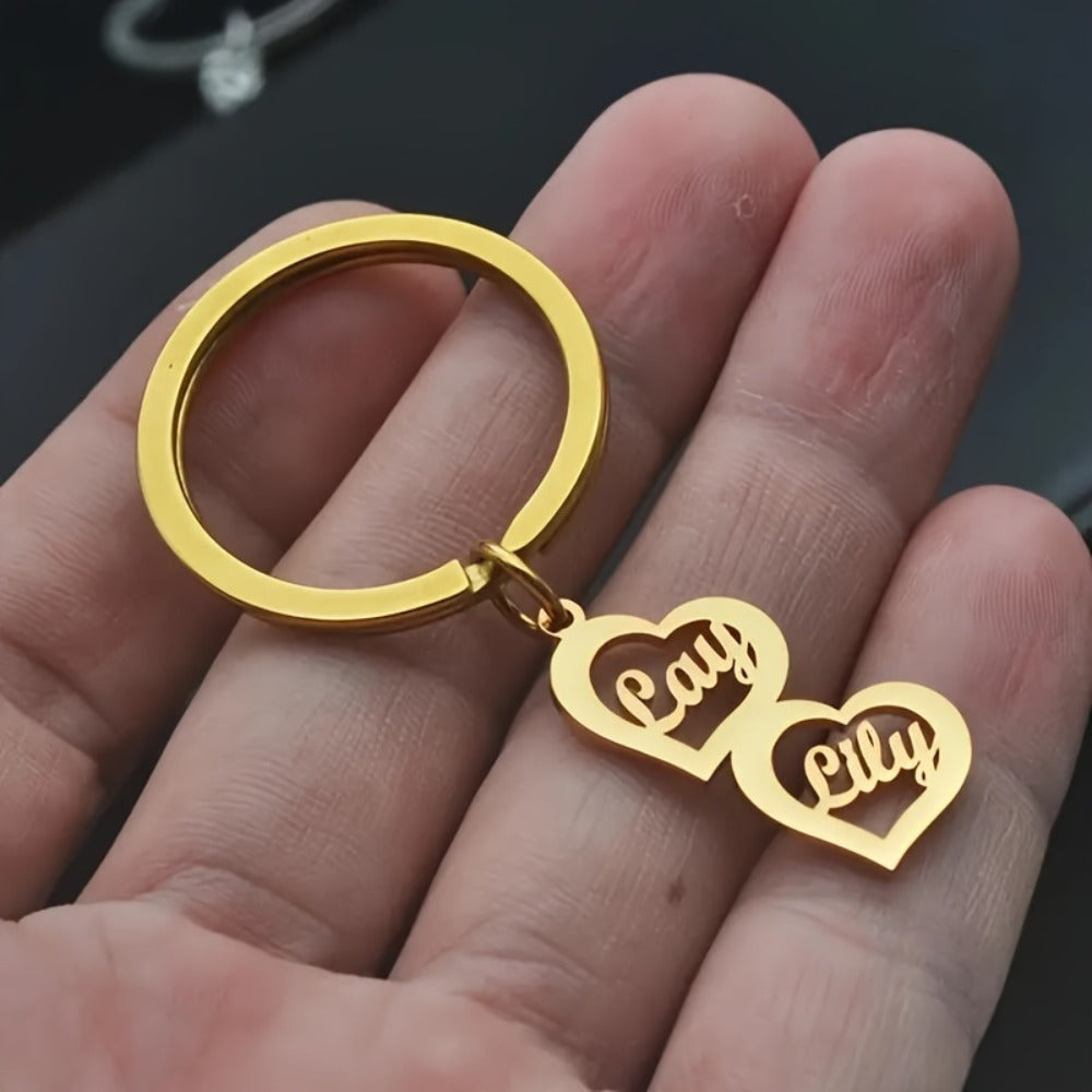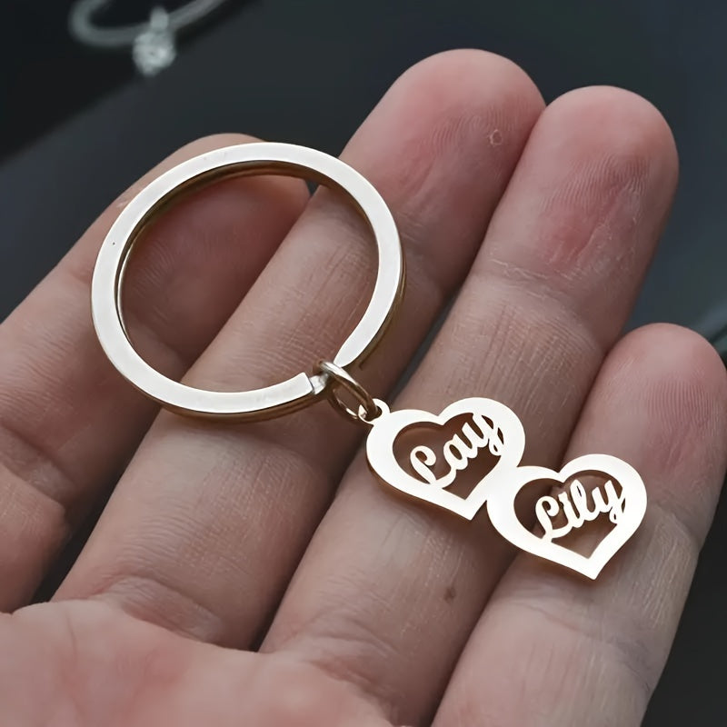 This personalized heart-shaped stainless steel keychain features the names of your choice, making it a thoughtful and unique gift for a loved one.