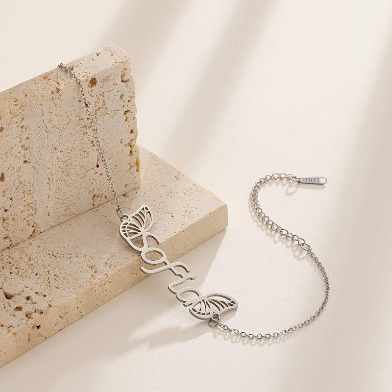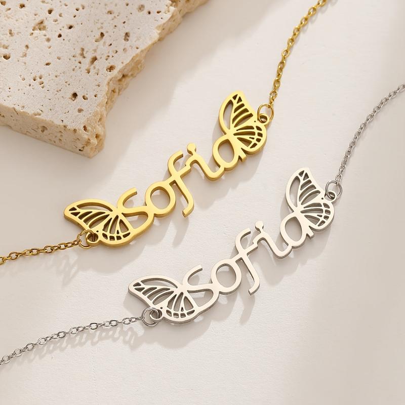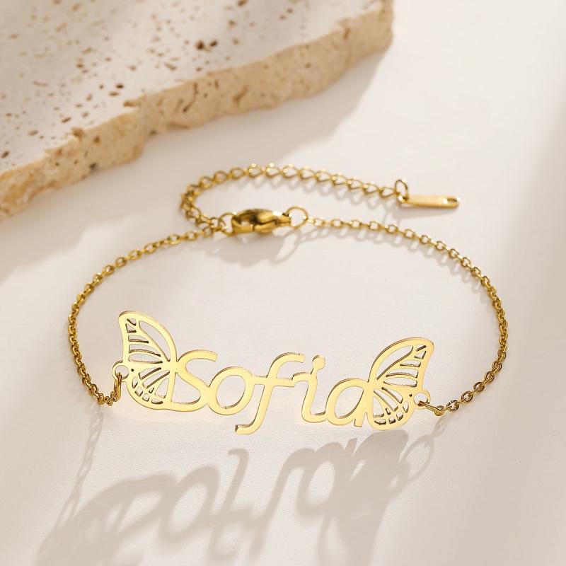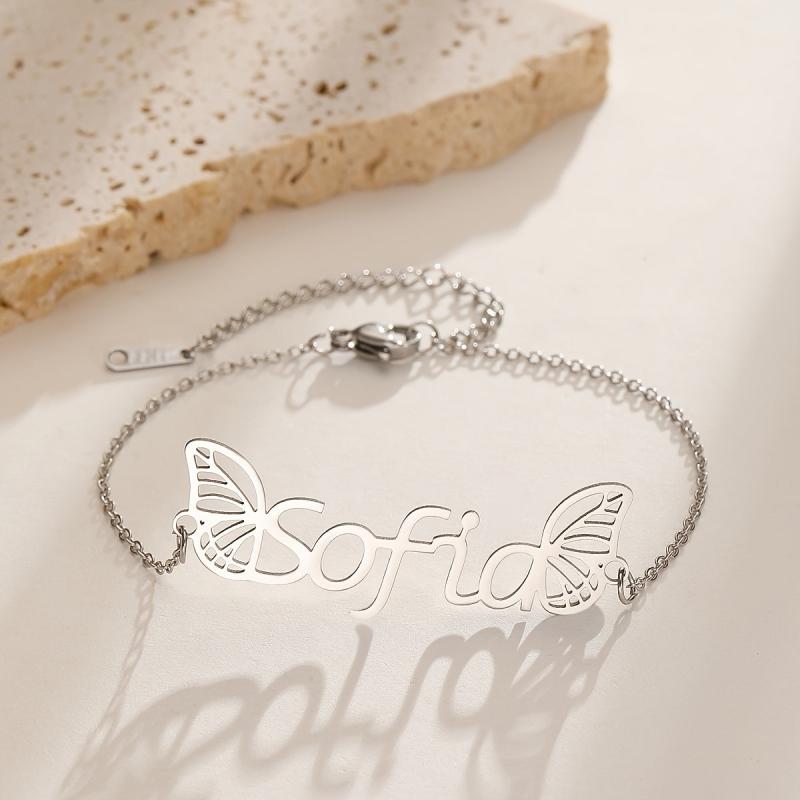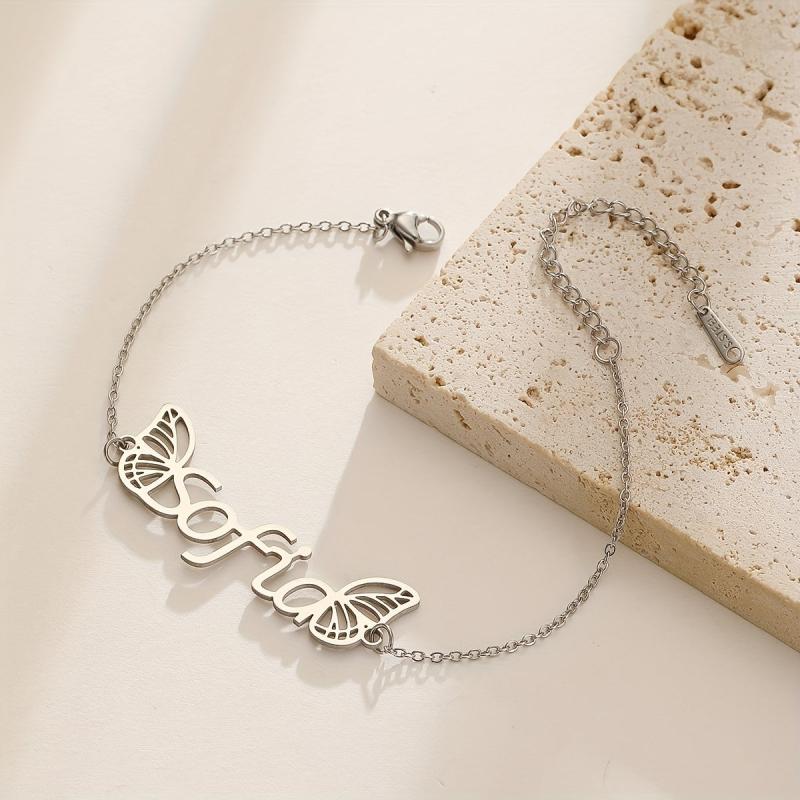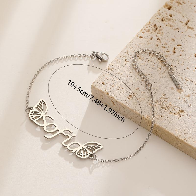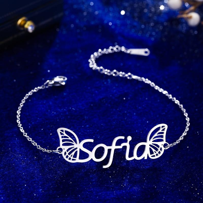 Elegant custom name pendant bracelet with wings design, crafted from high-quality stainless steel. The perfect gift for your girlfriend or loved one.