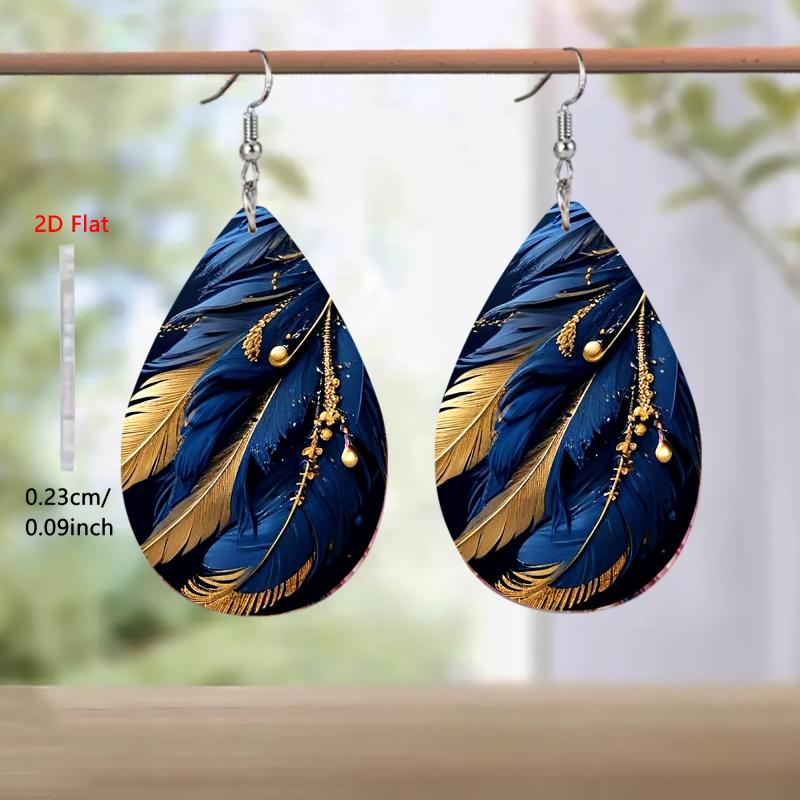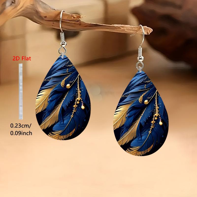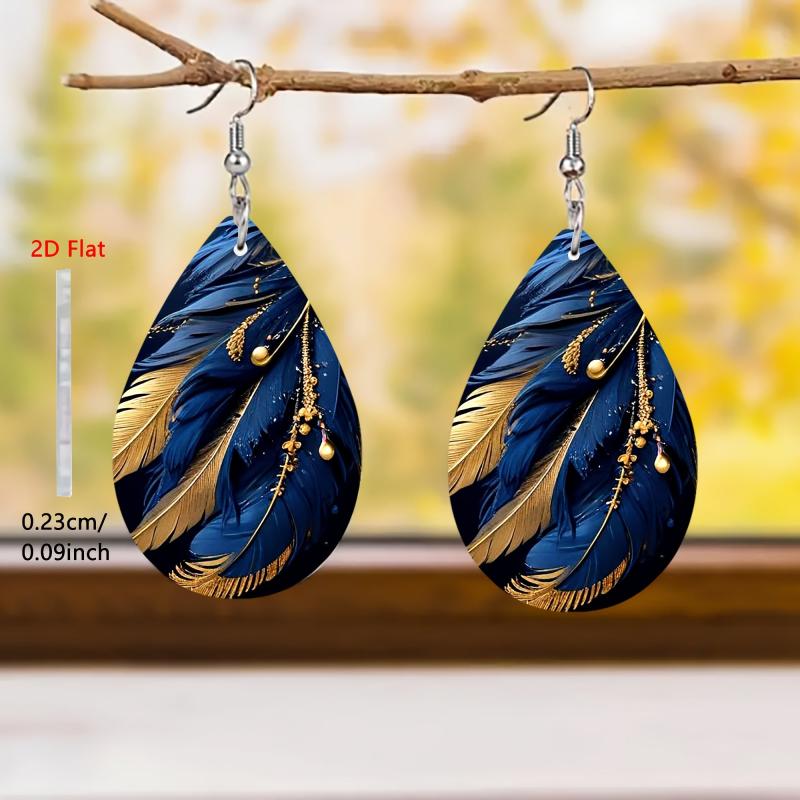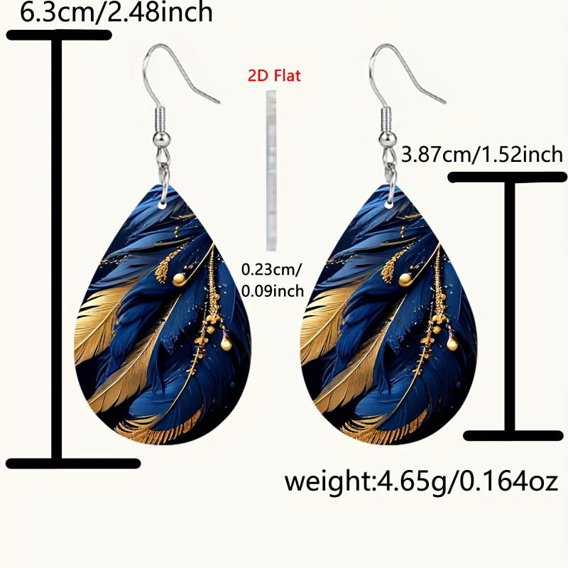 Elegant French-style acrylic earrings made of high-quality stainless steel. Features a dark sea and golden feather pattern, perfect for a mature and sophisticated look.