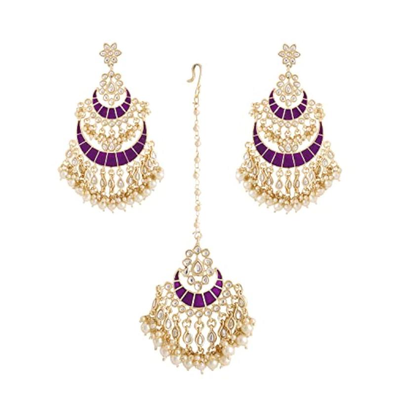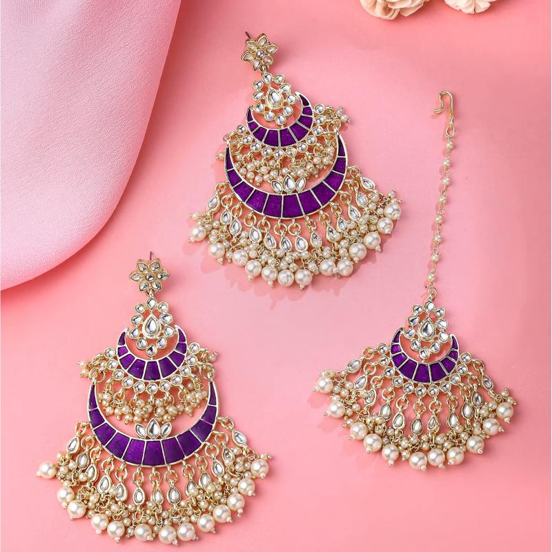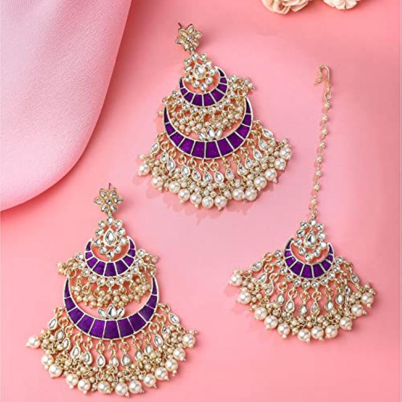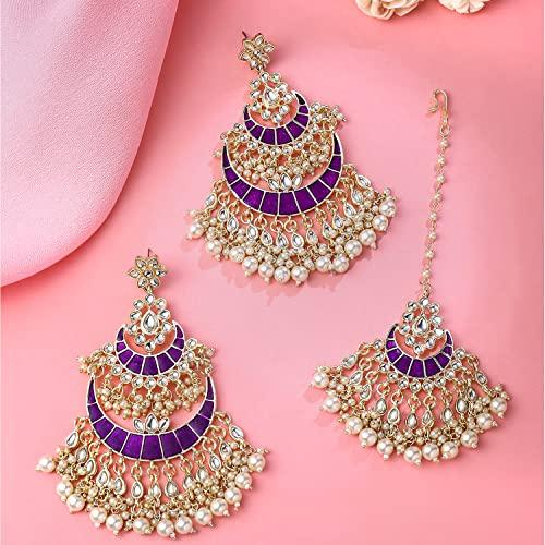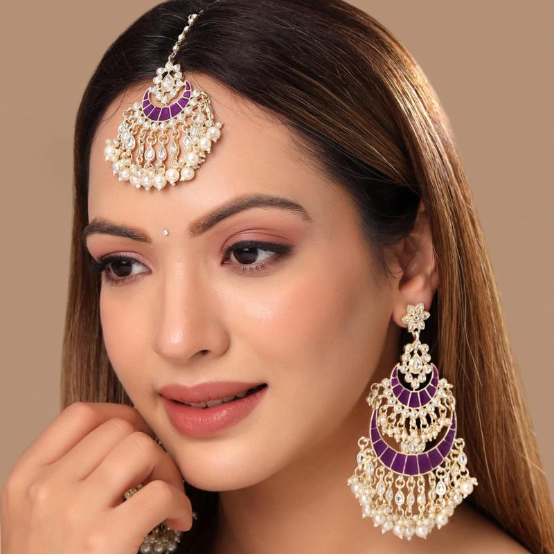 These stunning chandbali earrings feature intricate kundan work on red stones. Perfect for festive occasions.