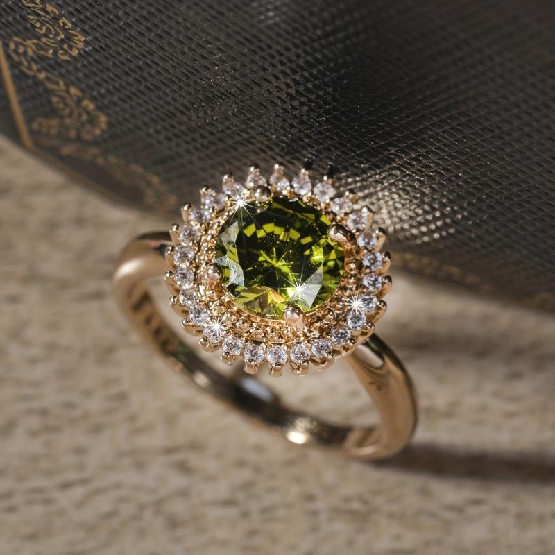 This stunning flower-shaped ring features an emerald green synthetic zirconia stone with sparkling copper accents. Perfect for wedding and engagement parties, this sophisticated piece of jewelry will add a touch of elegance to any outfit.