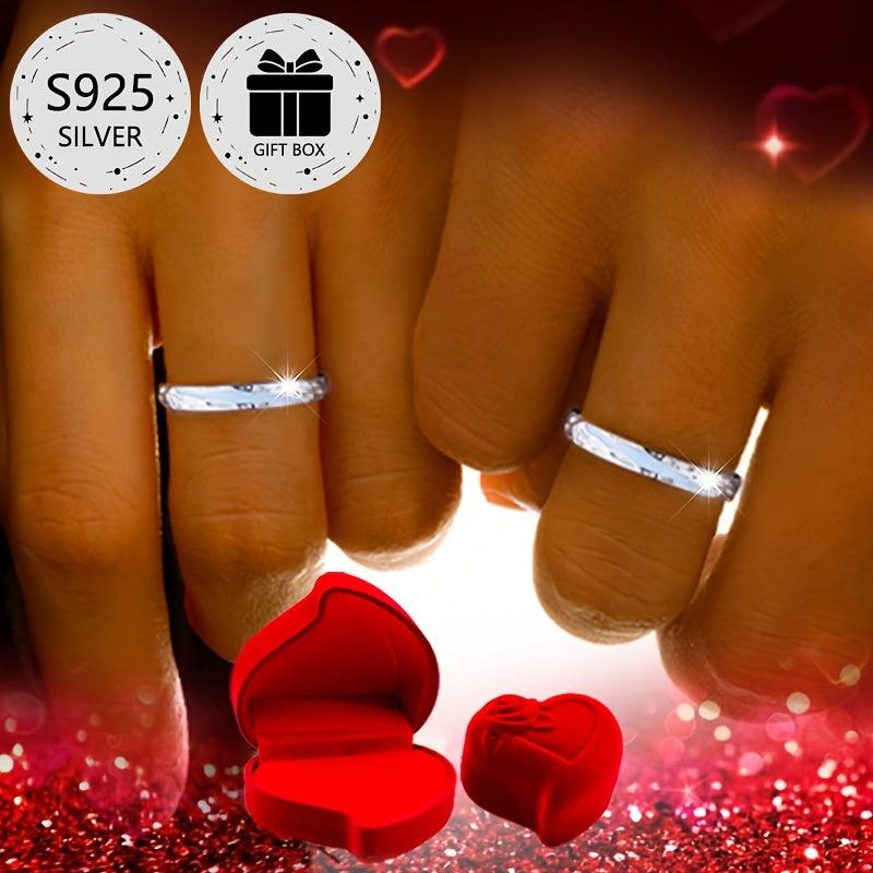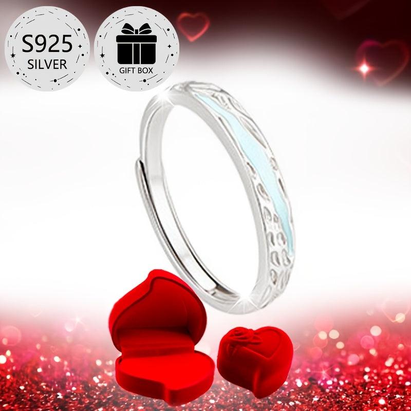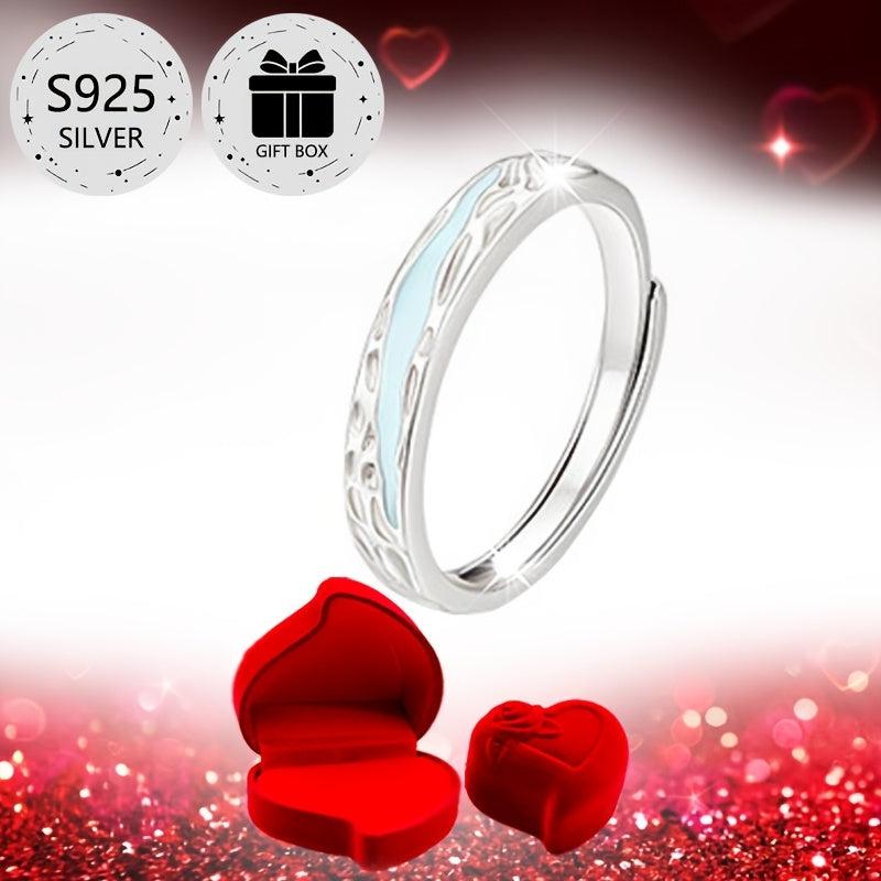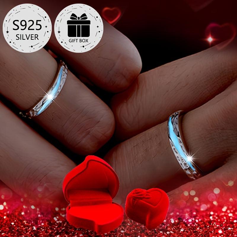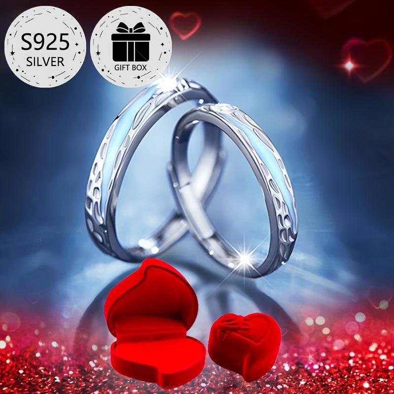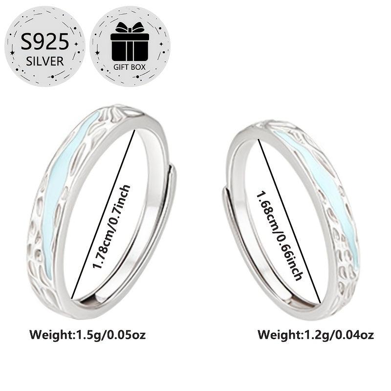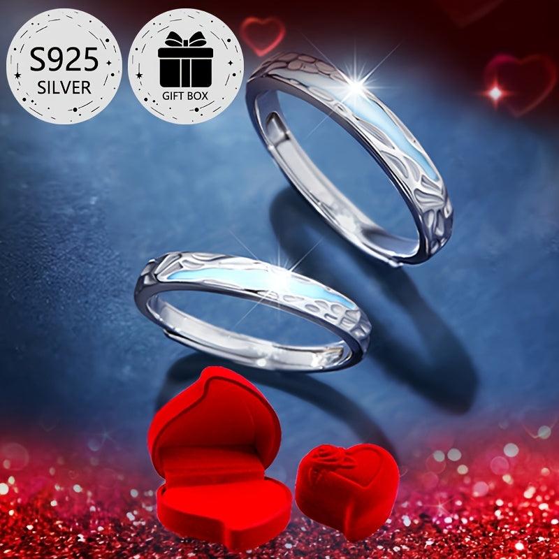 This set includes two adjustable open rings made of 925 silver, featuring enamel and glow-in-the-dark elements. Packaged in a heart shape, perfect for engagement.