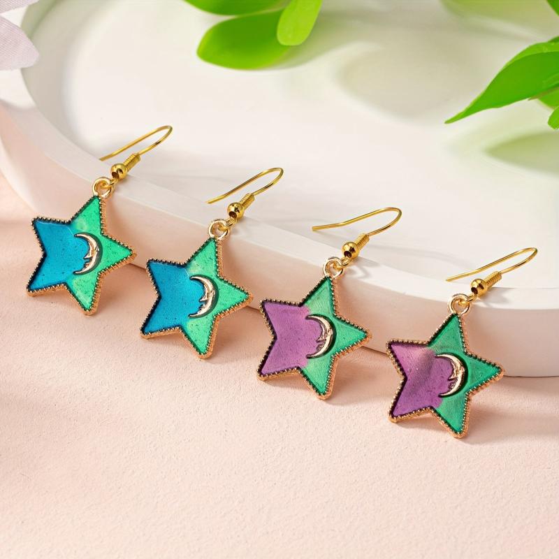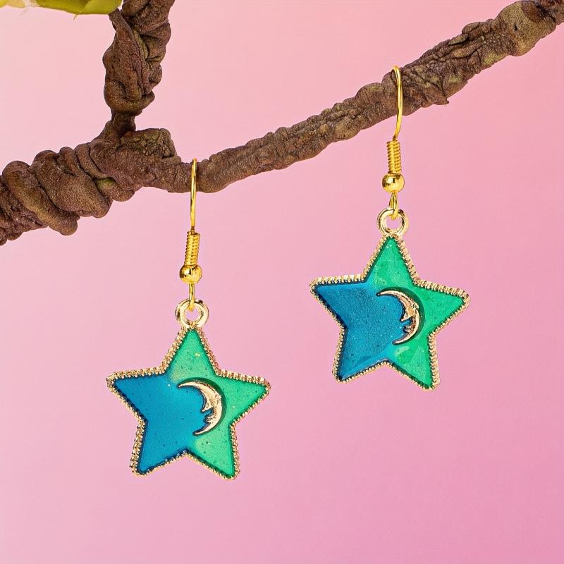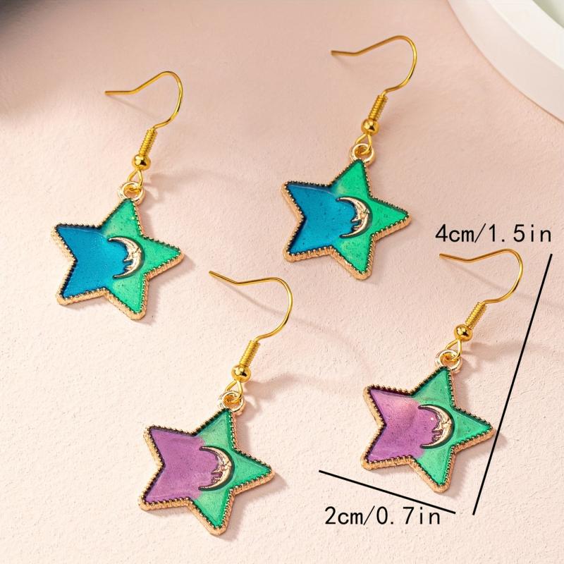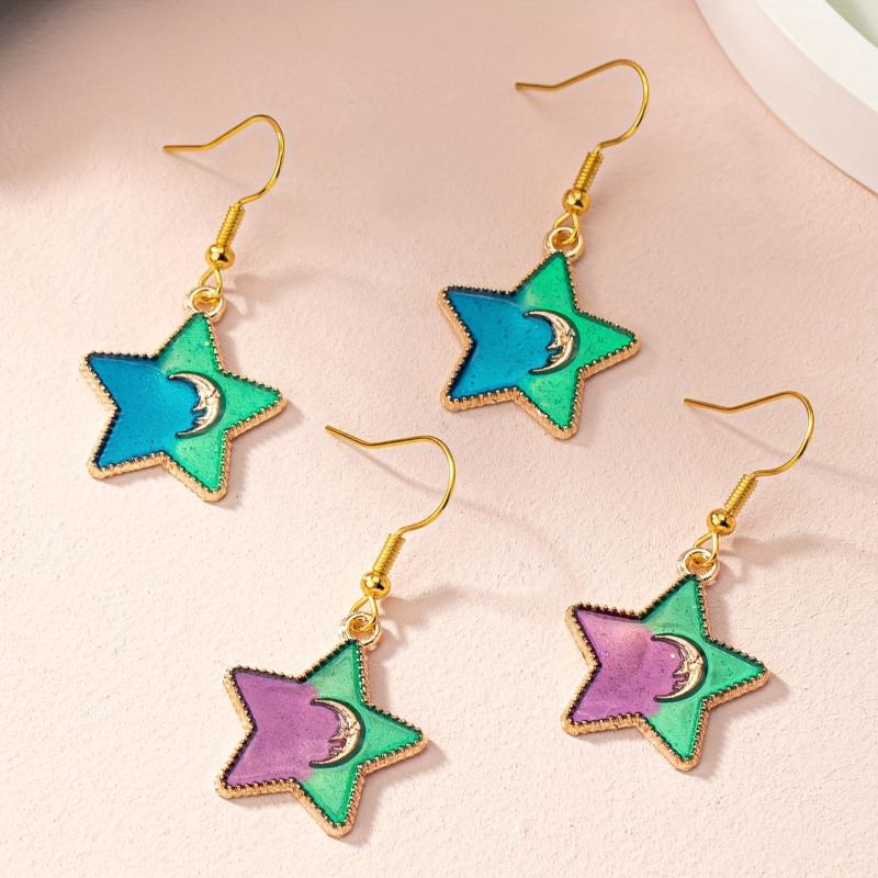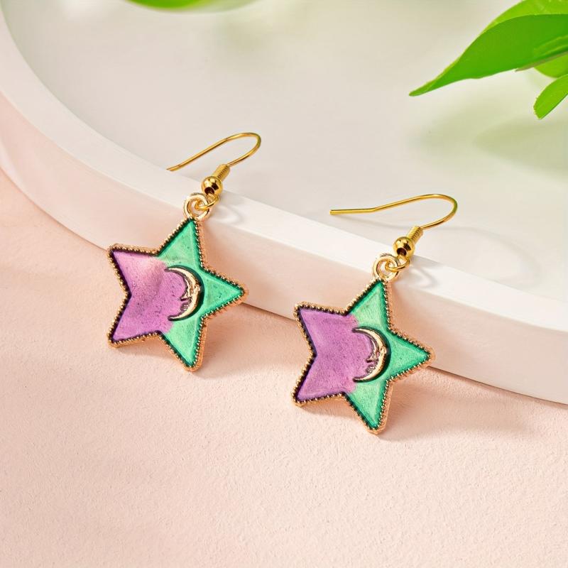 Add a pop of color to your outfit with these vintage-inspired enamel earrings. Perfect for casual wear or parties, they feature a star and moon design in green, purple, and pink tones.