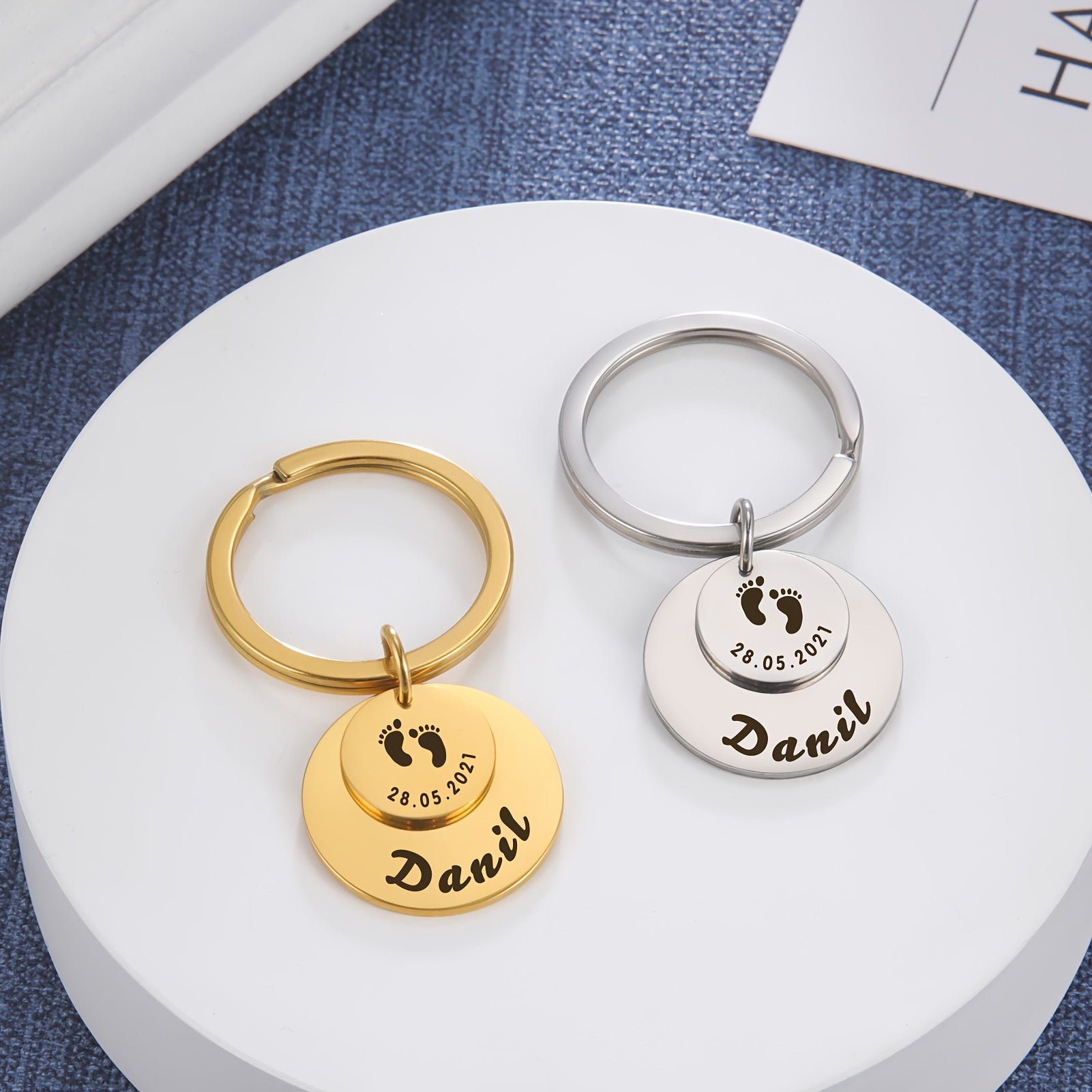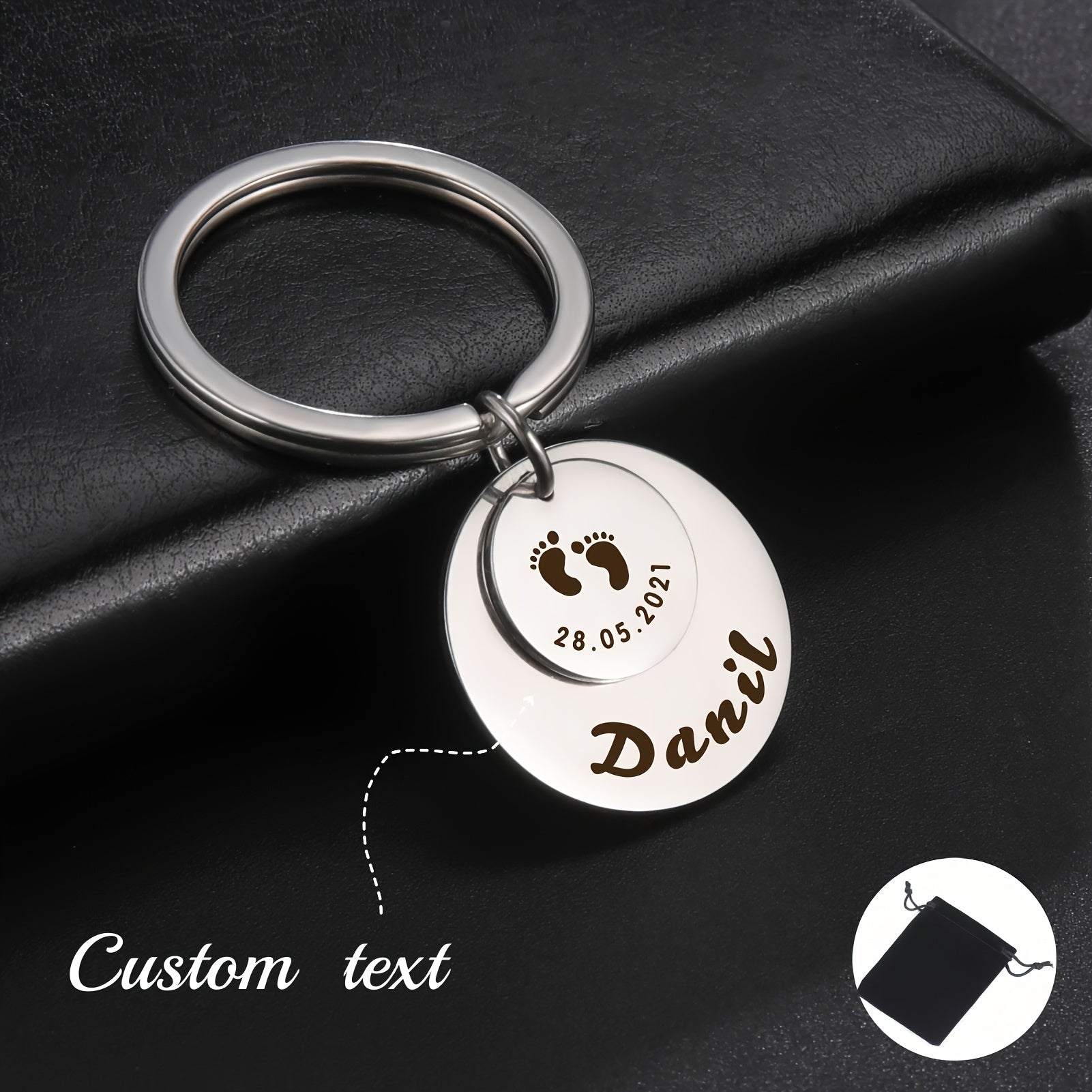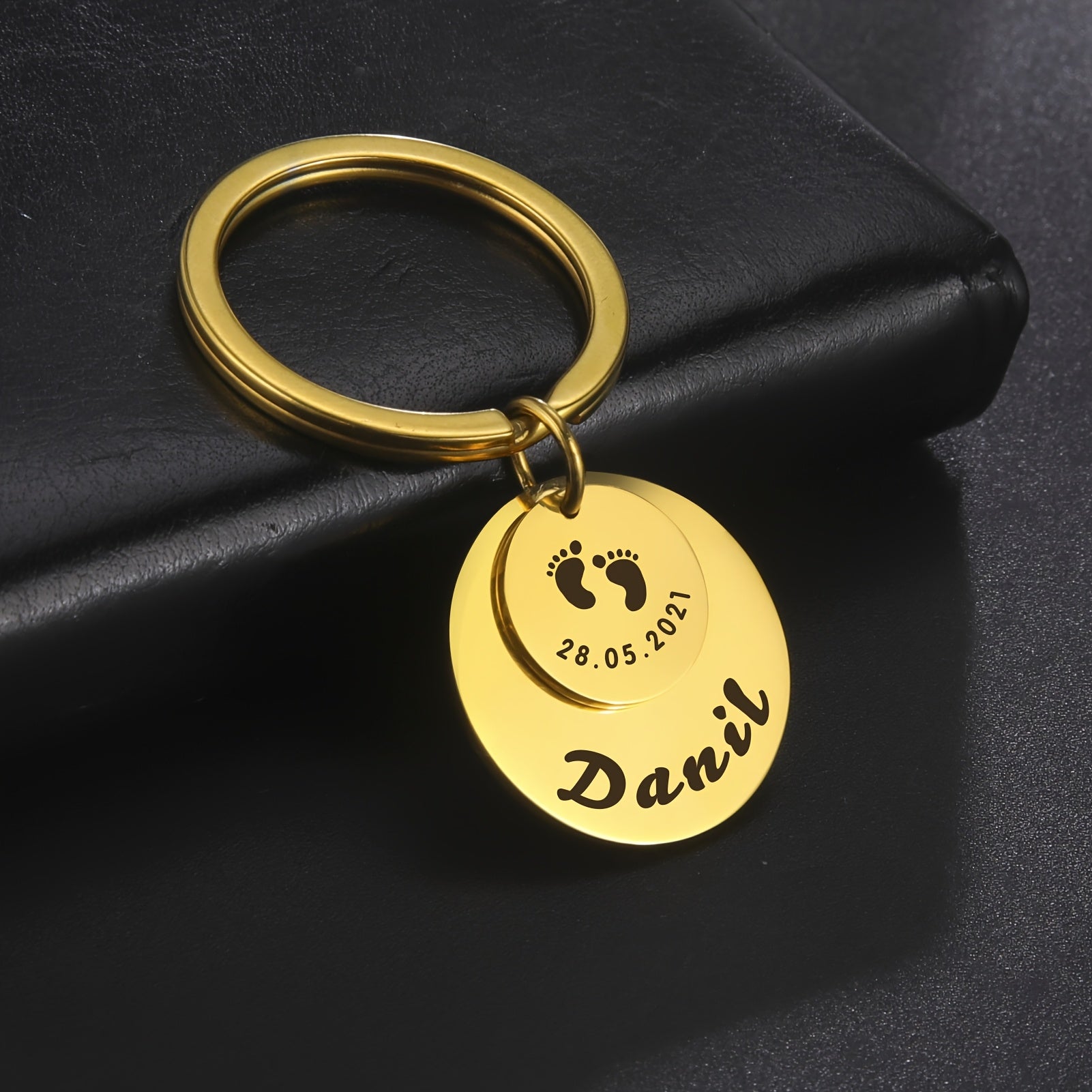 Beautifully engraved keychain featuring a cute footprint design and customized with a name. A thoughtful gift for anyone special in your life.