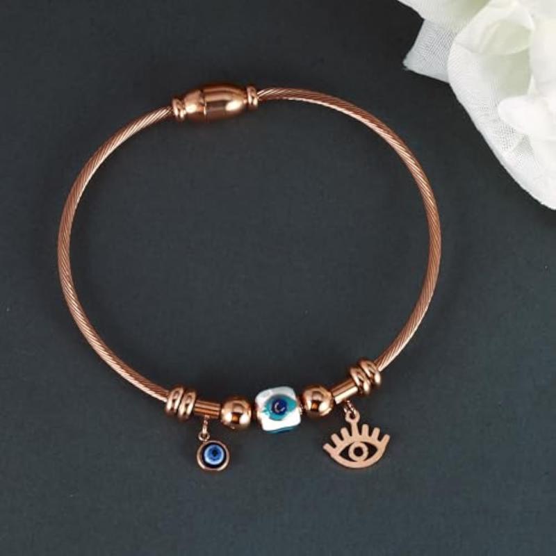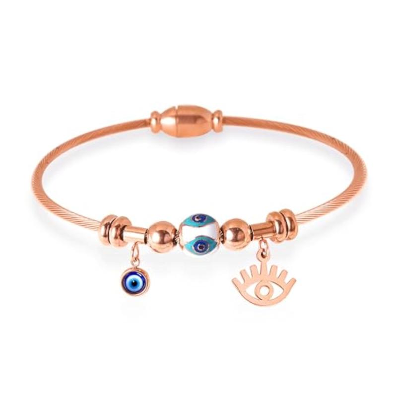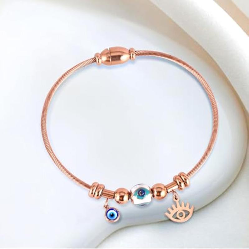 This evil eye bracelet is perfect for women who want to add a touch of style to their look. The bangle is anti-tarnish and features a beautiful rose design. It is a great accessory for any occasion.