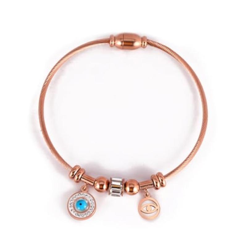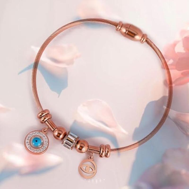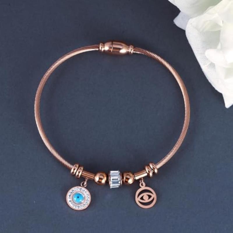 This evil eye bracelet is a fashionable and protective accessory. It features a rose gold kada design that complements any outfit. Perfect for girls and women who want to ward off negative energy.