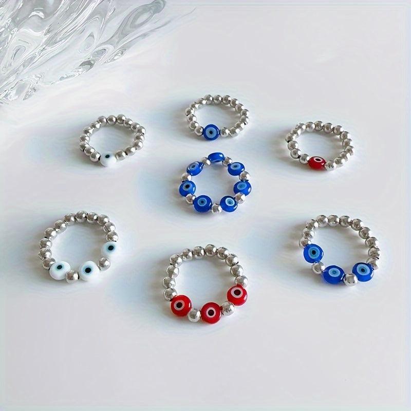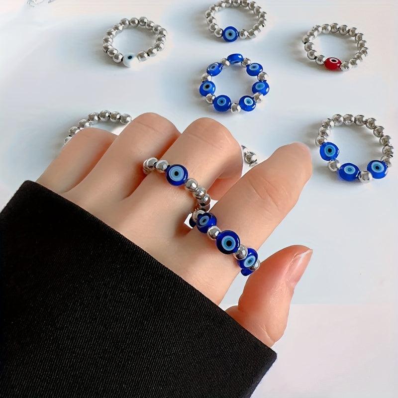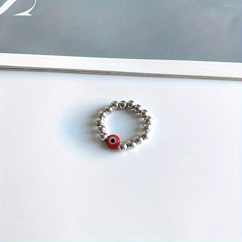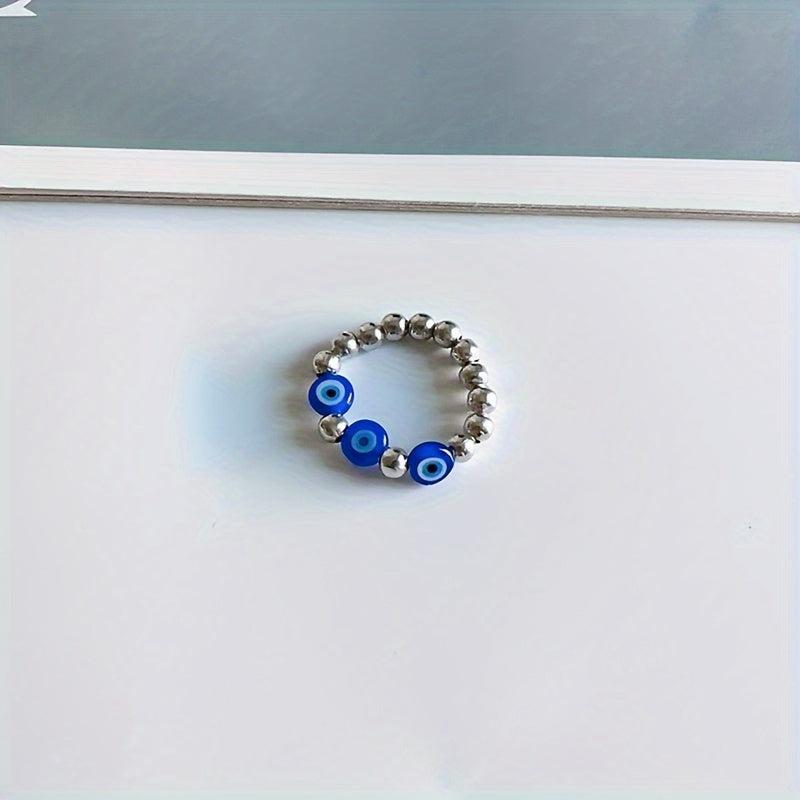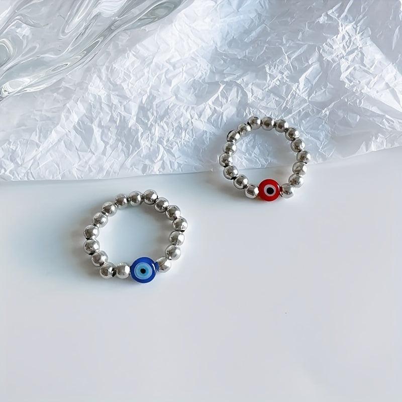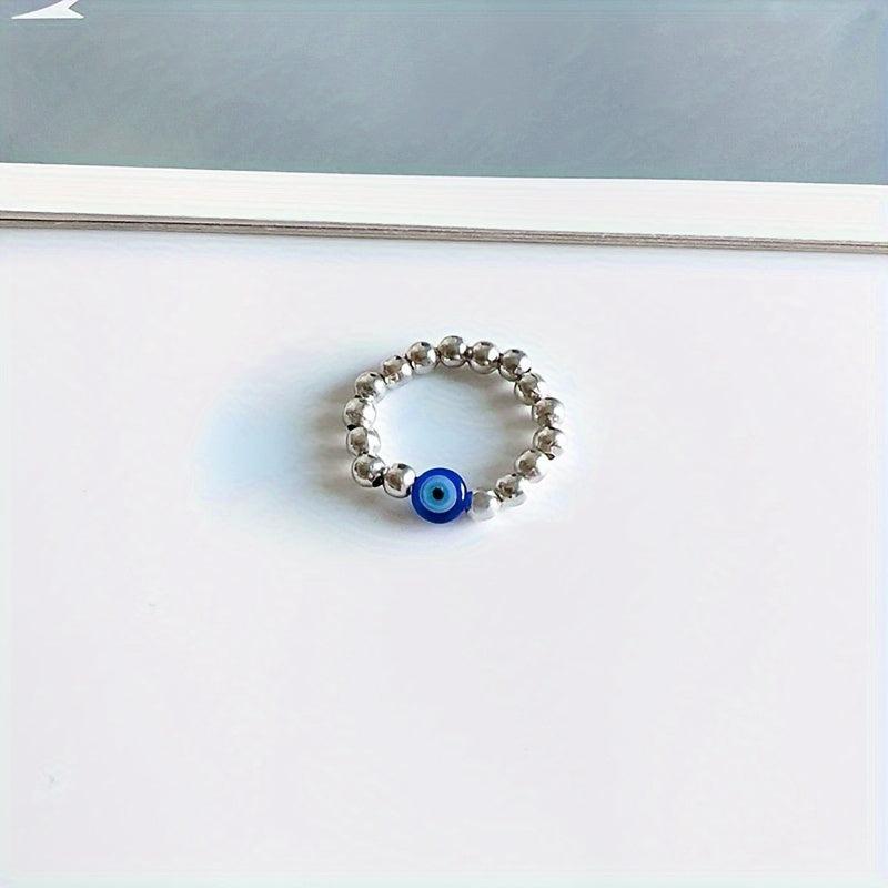 Stay protected with this stackable adjustable ring featuring an evil eye charm. This silvery beaded jewelry is perfect for daily wear or as a thoughtful gift for good luck and protection.