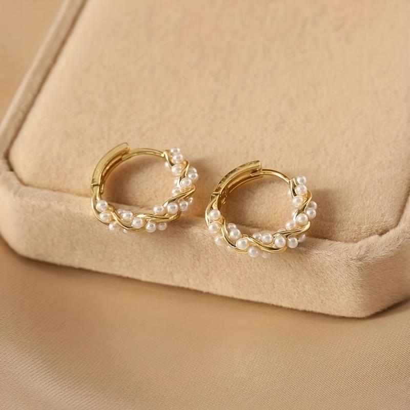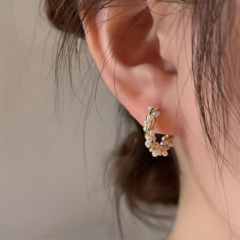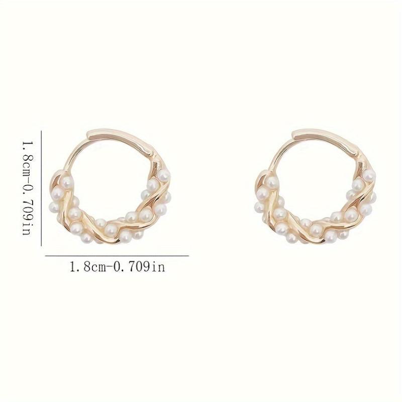 Add a touch of retro charm to your outfit with these faux pearls hoop earrings. Made with plastic and 18K plated, these earrings feature a woven ear buckle design.