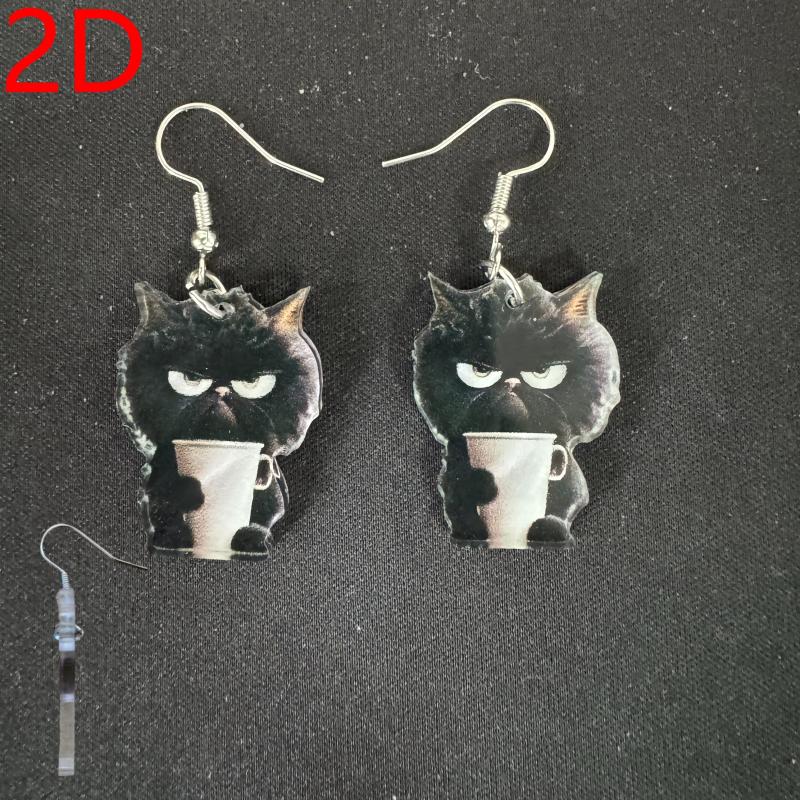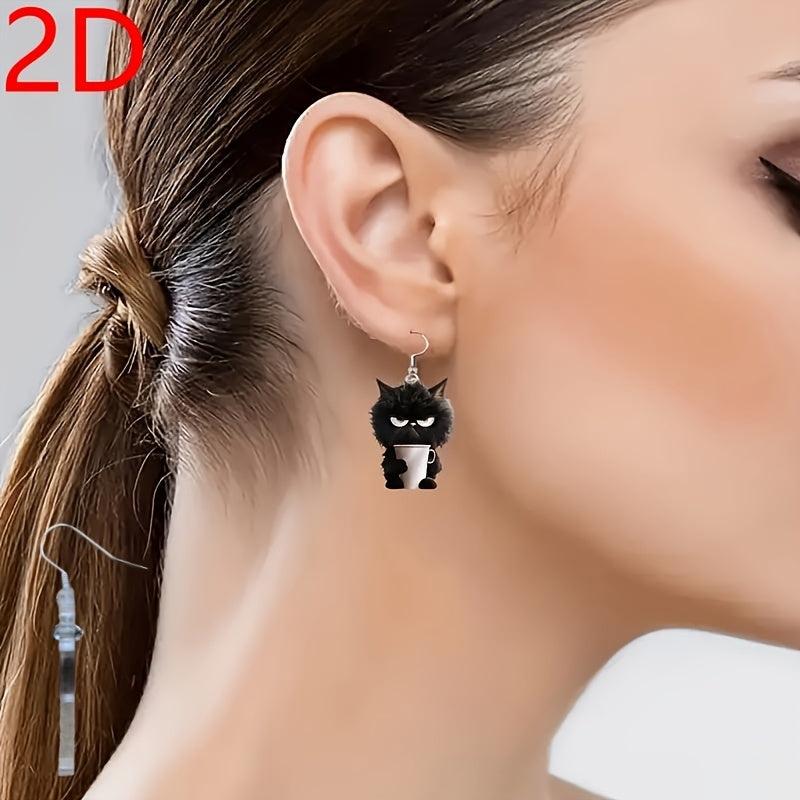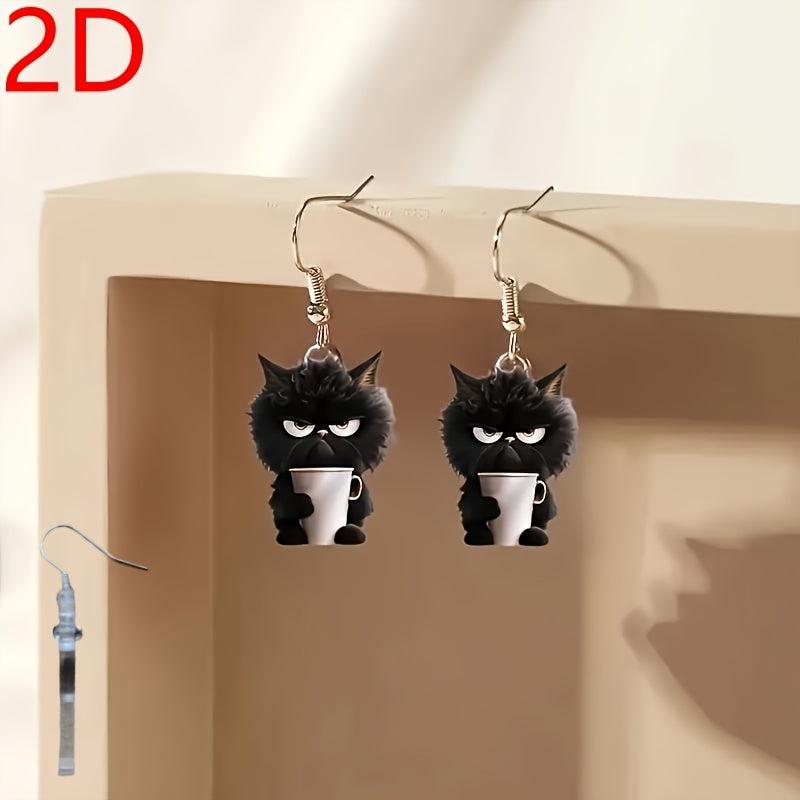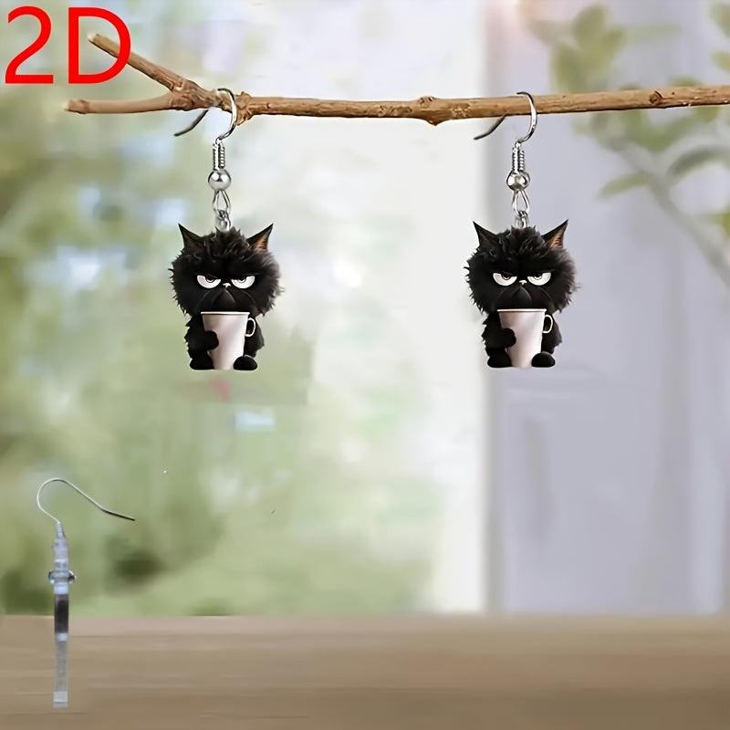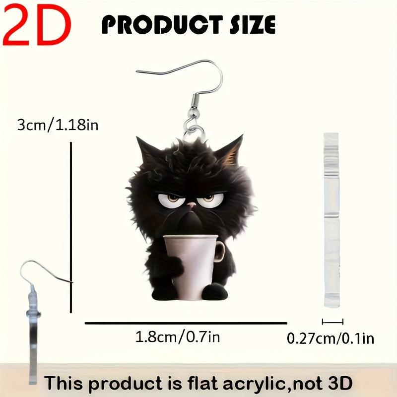 Adorable 2D flat cartoon cat and teacup dangle earrings made of playful acrylic. Ideal for Halloween, Thanksgiving, Christmas, Valentine's, birthdays, and more.