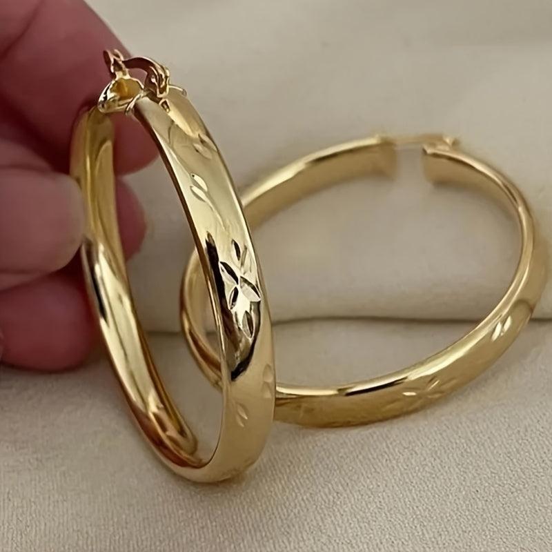 Elevate your style with these vintage-inspired large circle hoop earrings. Perfect for daily wear and parties, these golden earrings feature a beautiful floral carved design.