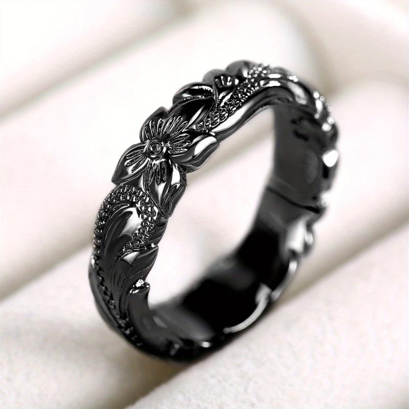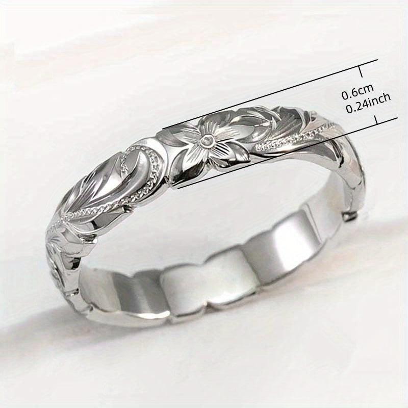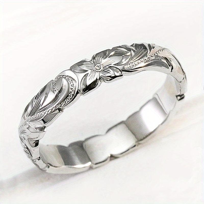 This Floral Engraved Ring in a rose gold finish features intricate flower detailing, perfect for casual attire or parties. Available in three sizes.