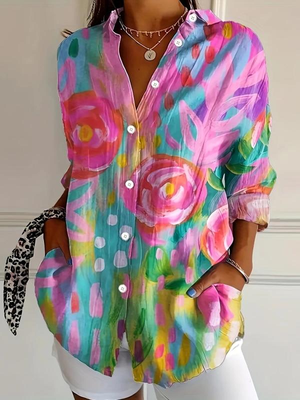 This vibrant women's blouse features a beautiful floral print in pink, yellow, and green. Perfect for spring and summer, it has long sleeves and a collared neckline, making it a stylish choice.