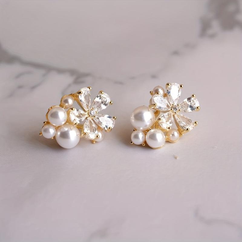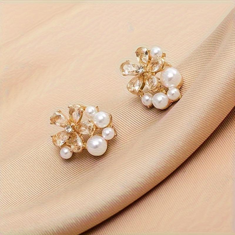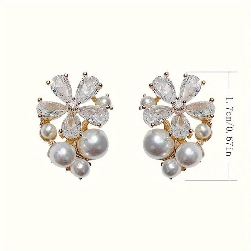 These elegant floral stud earrings feature pearls and synthetic cubic zirconia. Made with zinc alloy and stainless steel post, they are perfect for daily wear and add a touch of sophistication to any outfit.