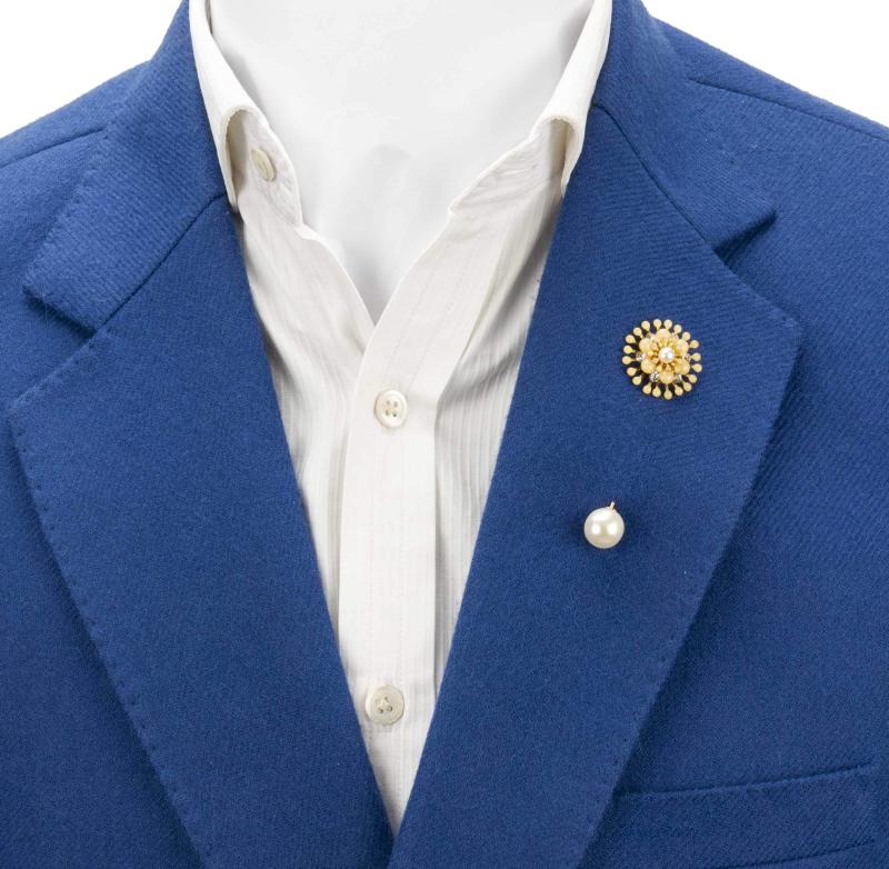 Elegant lapel pin featuring a flower design with pearl detailing, perfect for adding a touch of sophistication to any outfit.