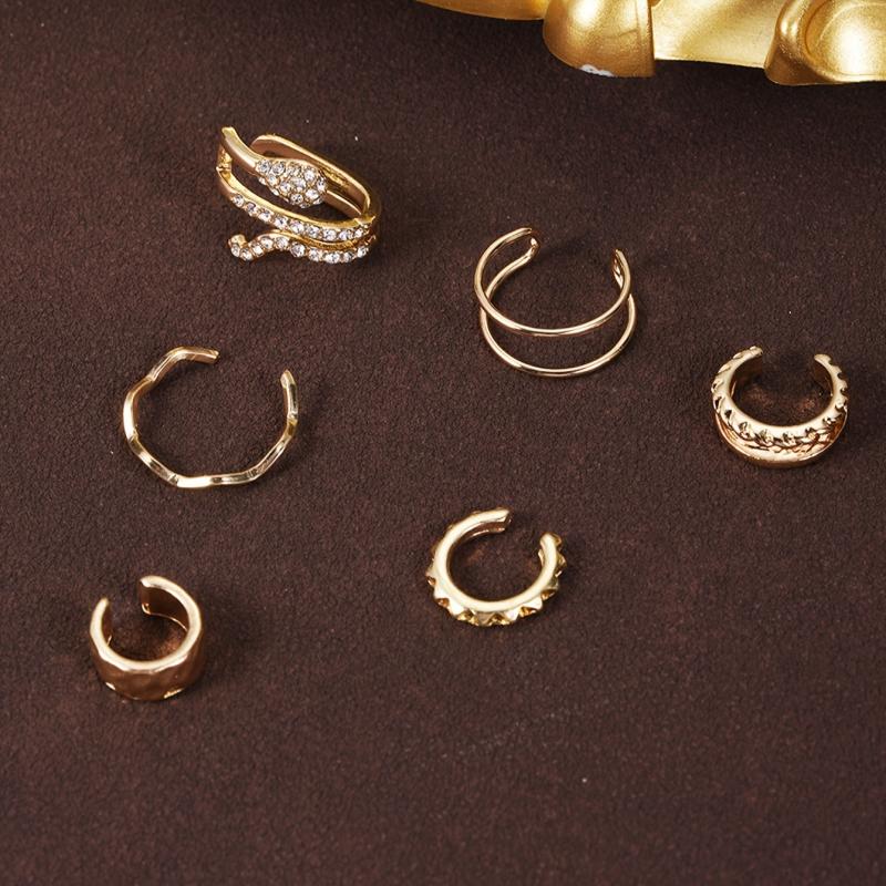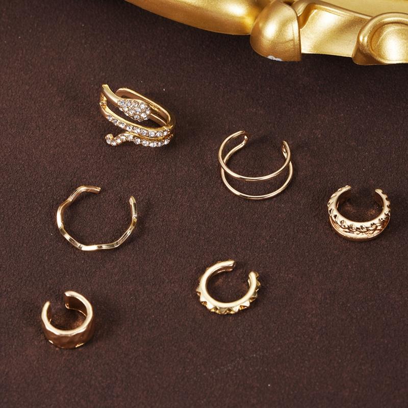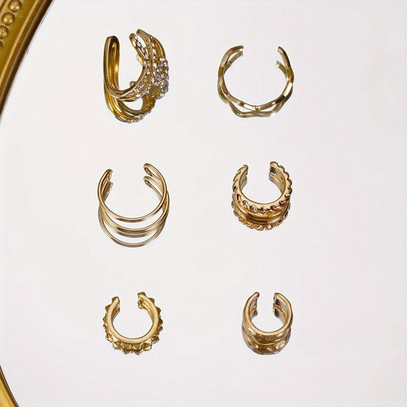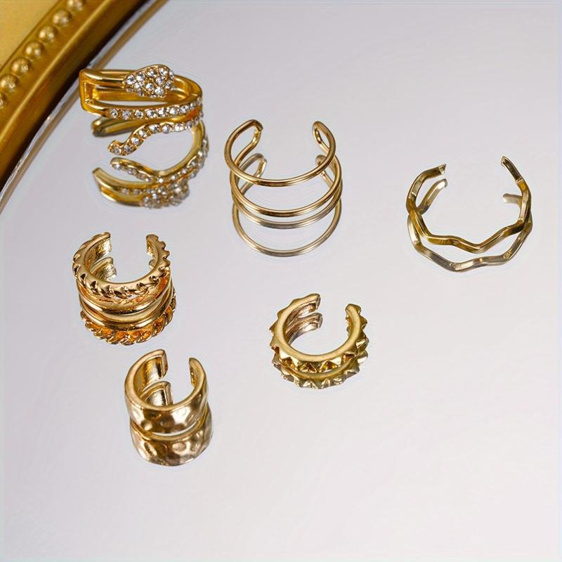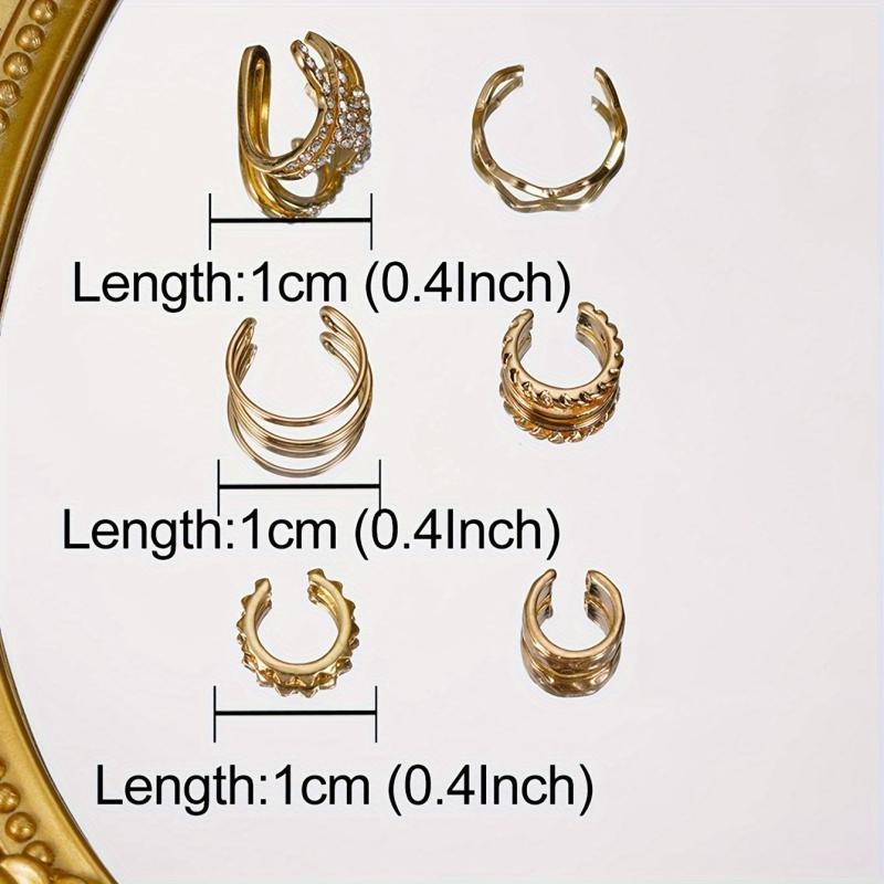 Add a touch of edgy glamour to your look with this 6pcs set of geometric snake shaped ear cuff earrings, featuring gemstone and rhinestone accents. Crafted from 18K golden plated copper, these earrings are perfect for daily wear or special occasions.