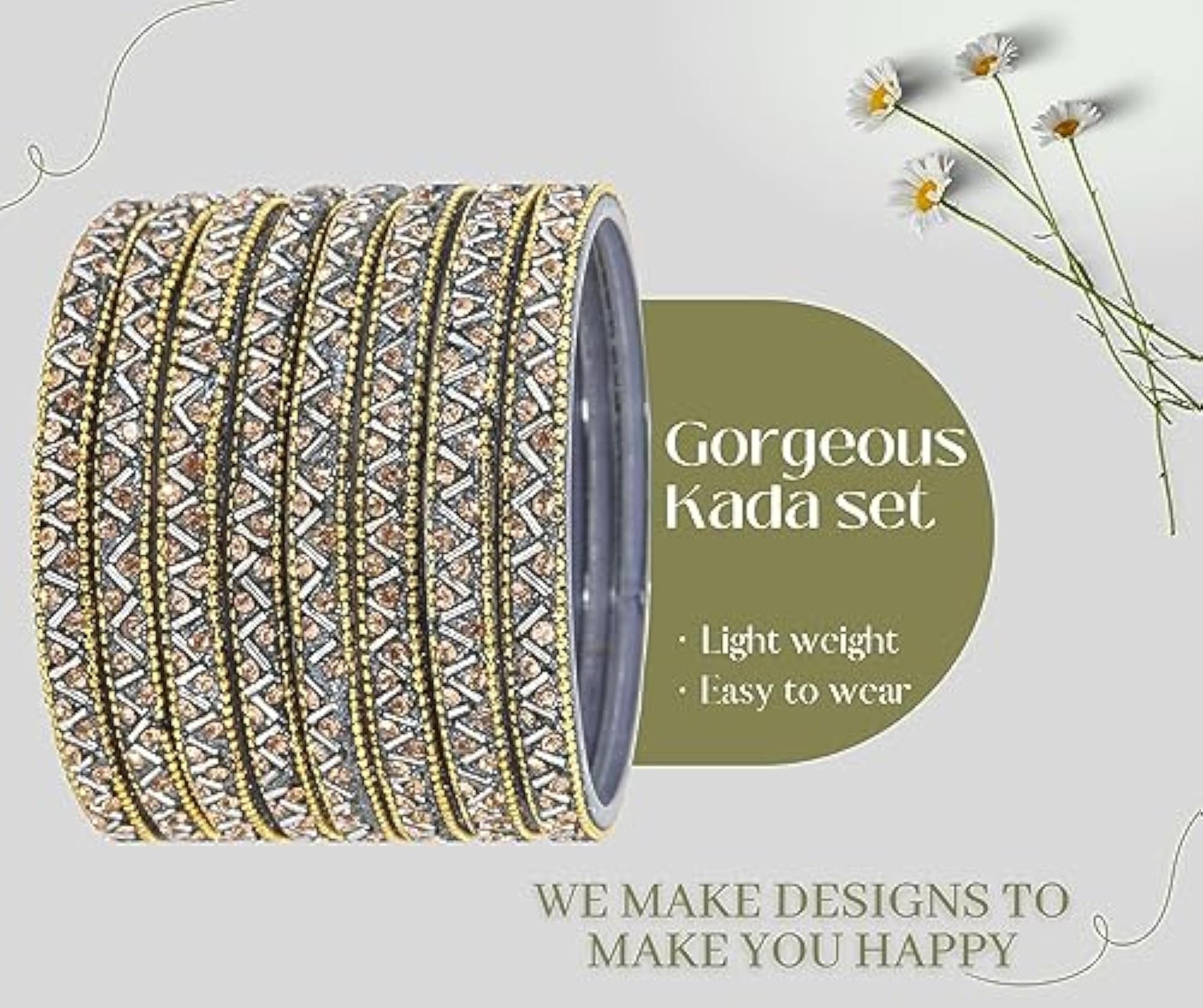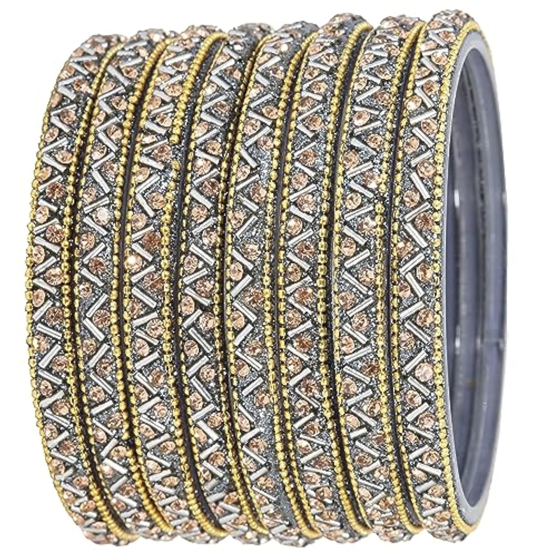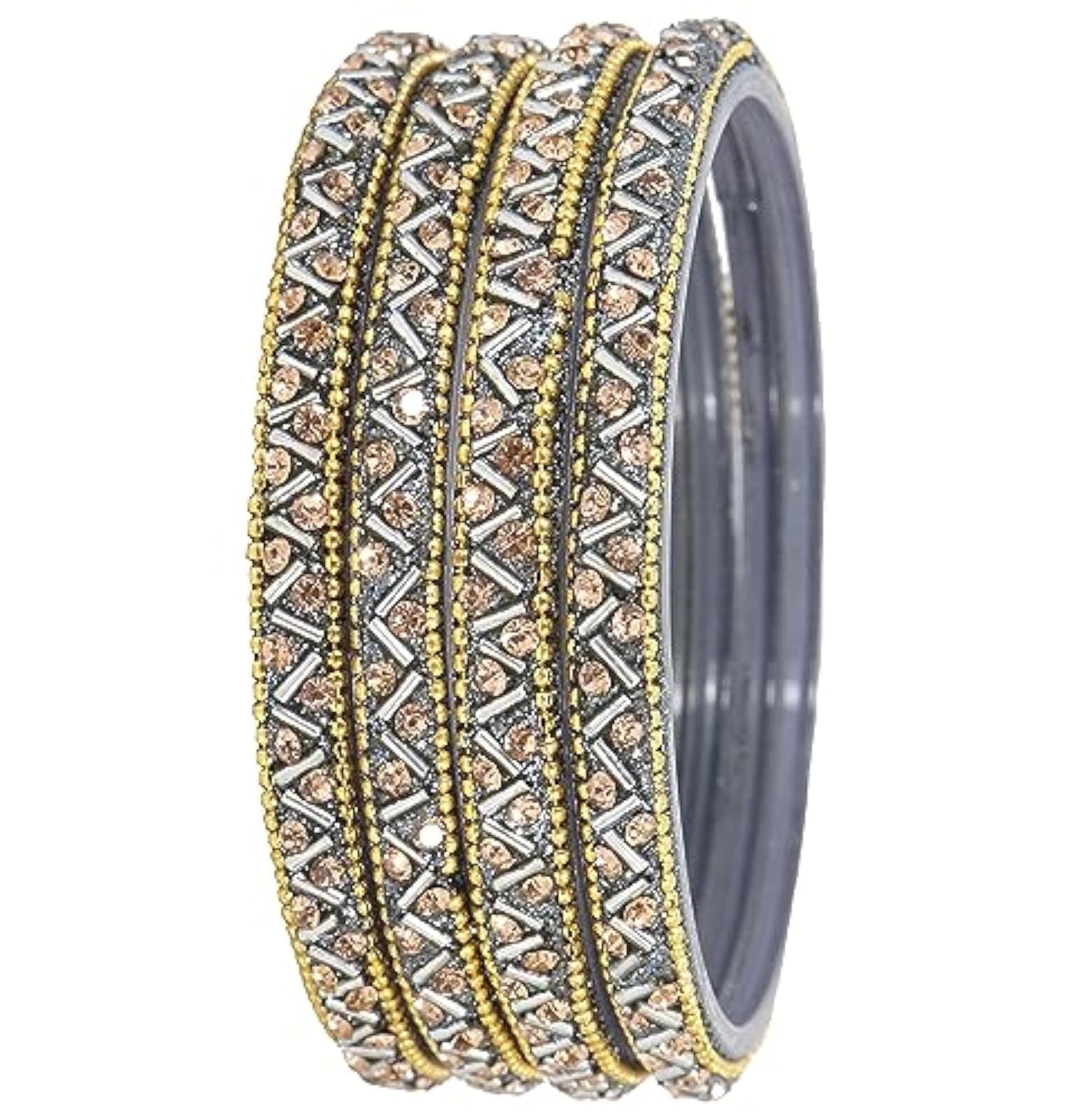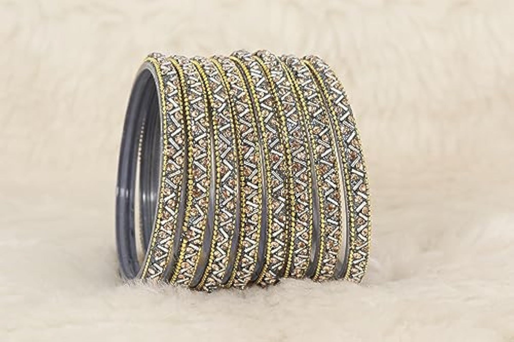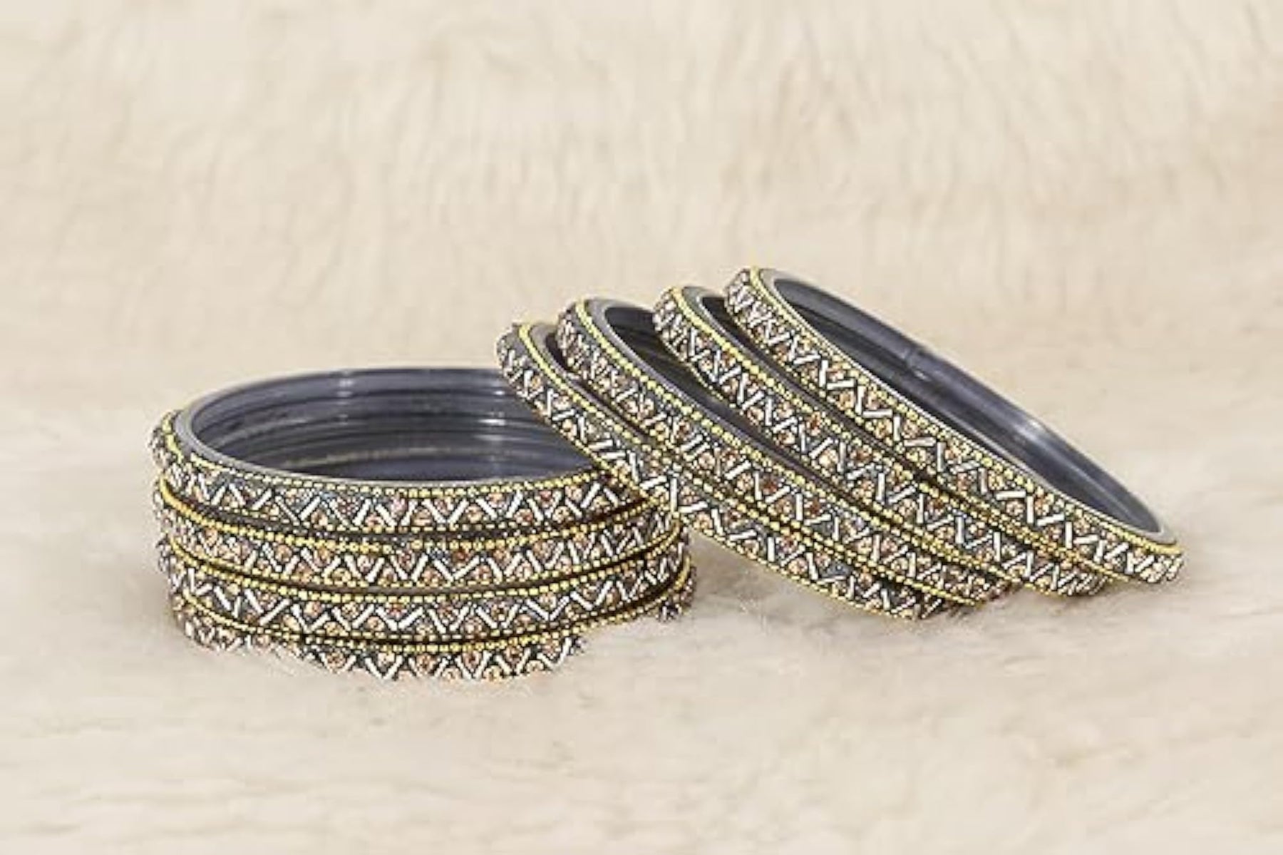 Elegant set of glass bangles featuring studded zircon gemstones and beads. Perfect for adding a touch of sophistication to any outfit.