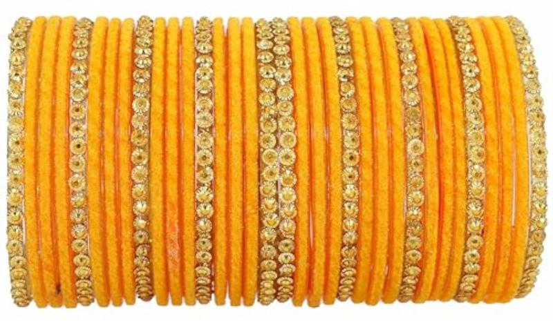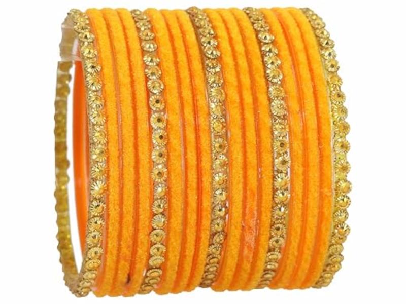 This stylish bangle set features glass and golden beads on a velvet base, making it a perfect accessory for both traditional and fancy occasions.