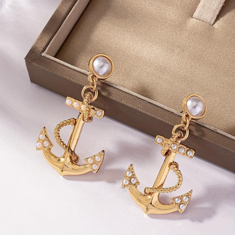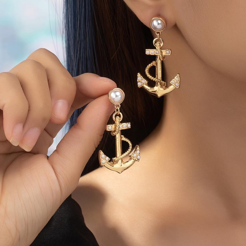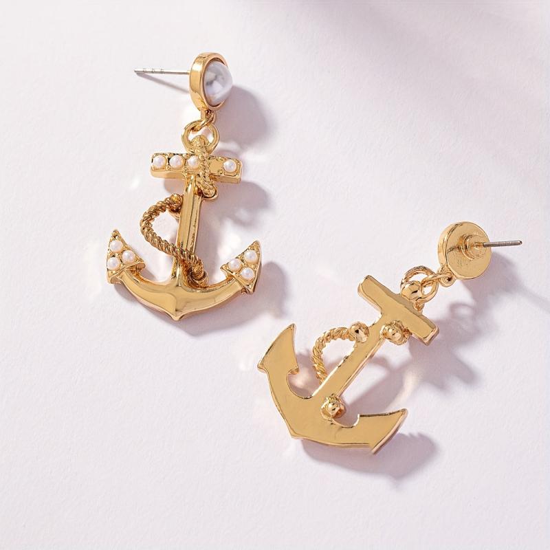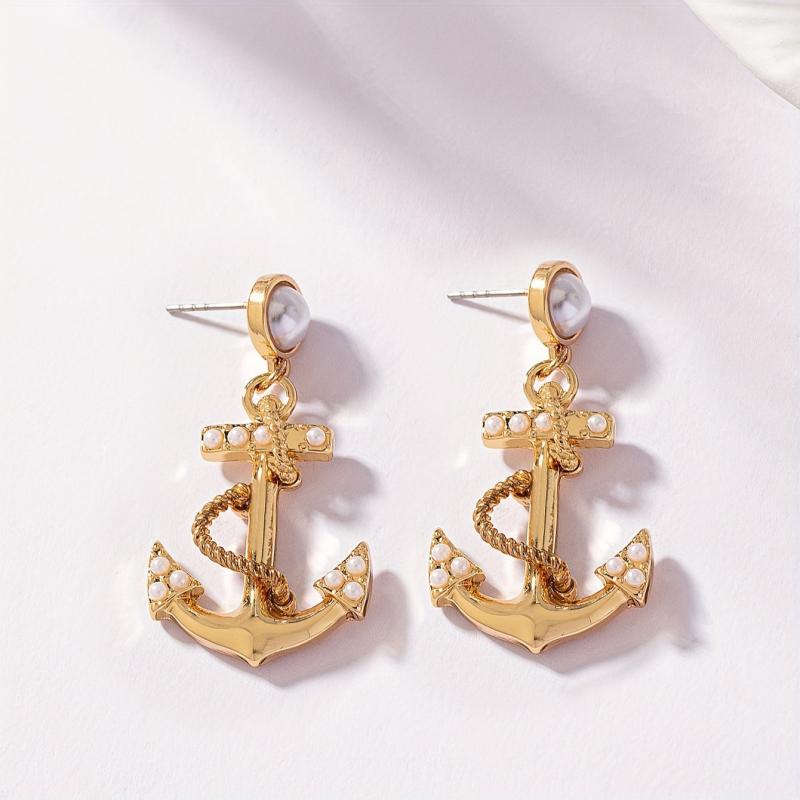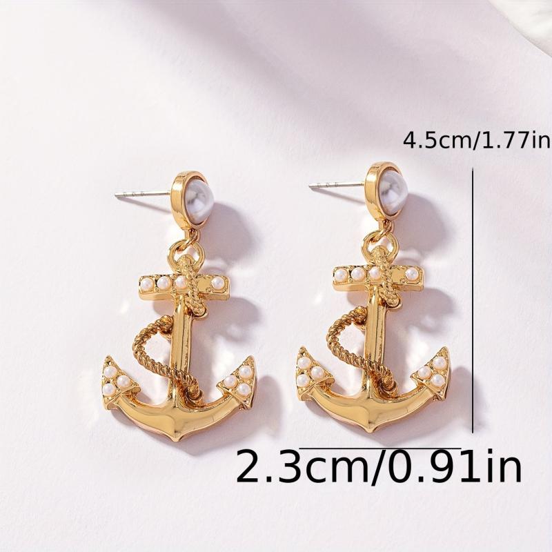 These nautical-inspired drop dangle earrings feature a golden anchor design with faux pearl accents, adding a touch of elegance to your look. Perfect for women who appreciate minimalist ethnic style jewelry.