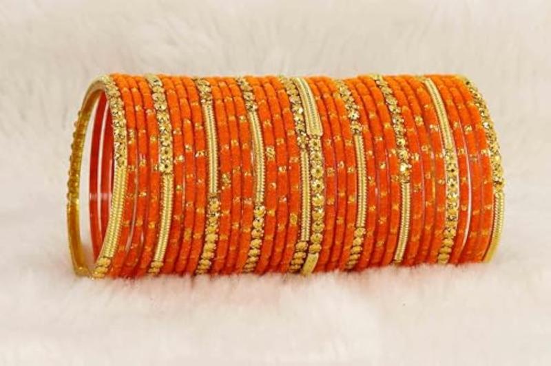 Add a touch of elegance to your outfit with this stylish chudi jewellery set. The set includes fancy glass bangles with golden beads and polka dots on velvet material. Perfect for special occasions.