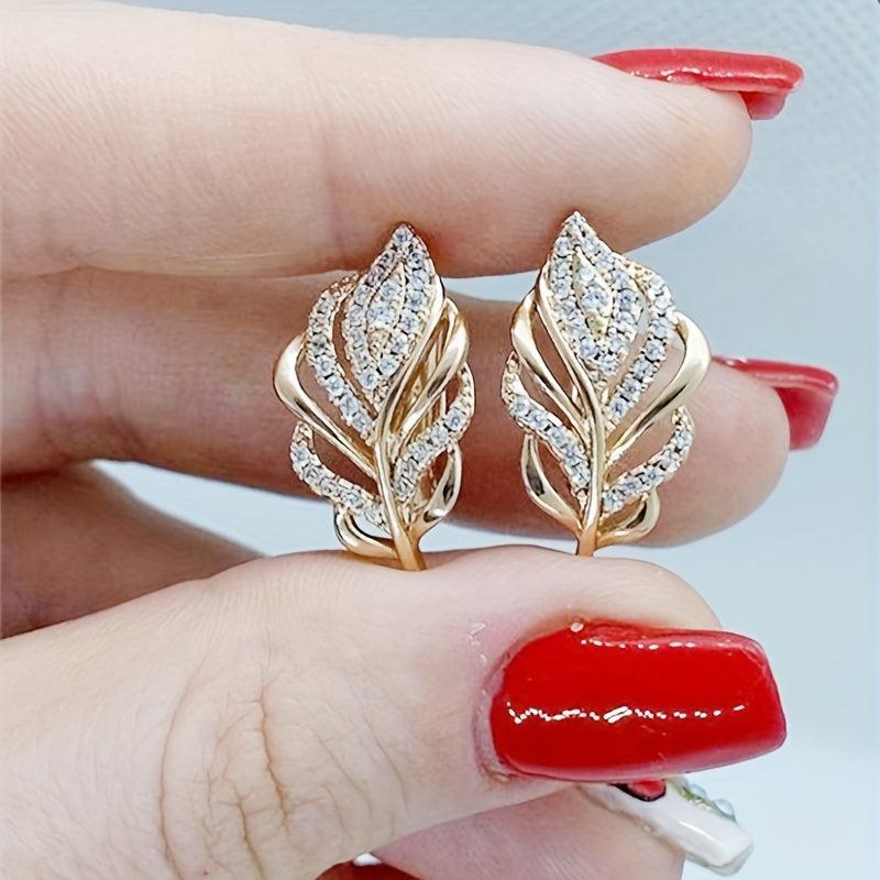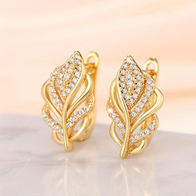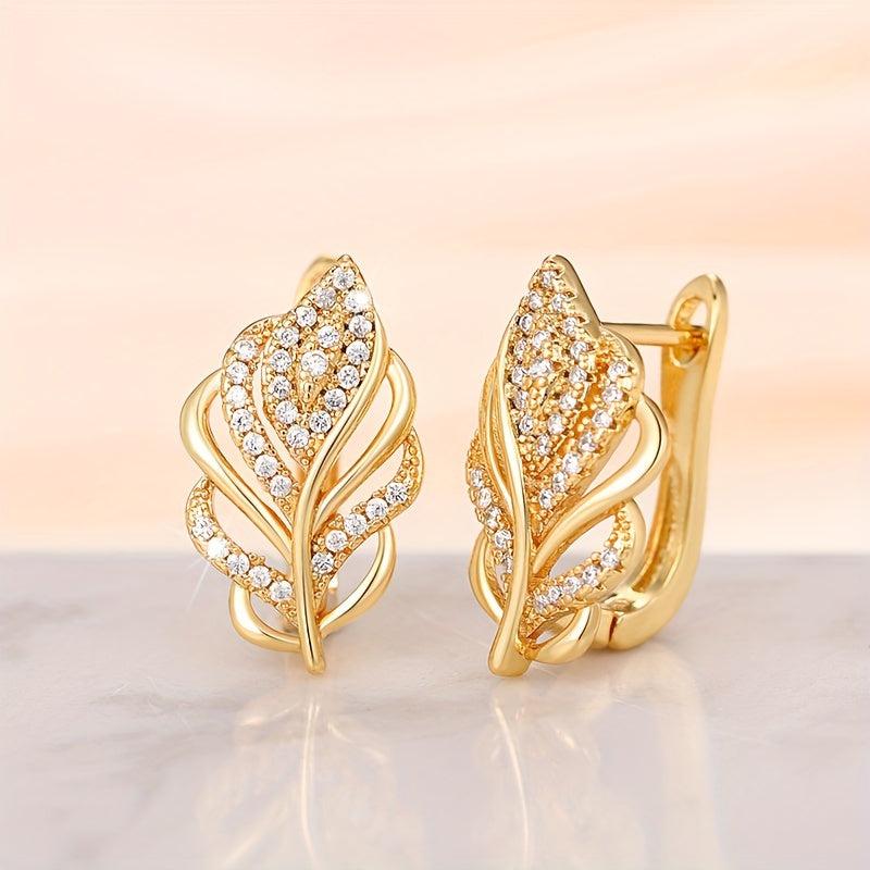 Add a touch of elegance to your look with these stunning golden leaf dangle earrings featuring sparkling zirconia accents. Perfect for both casual attire and special occasions.
