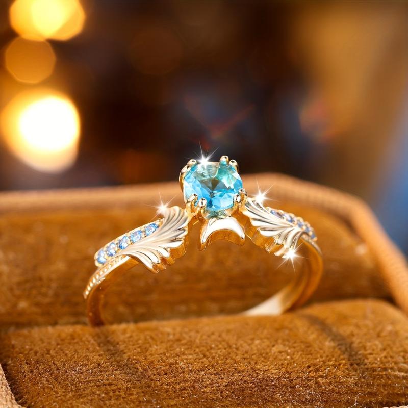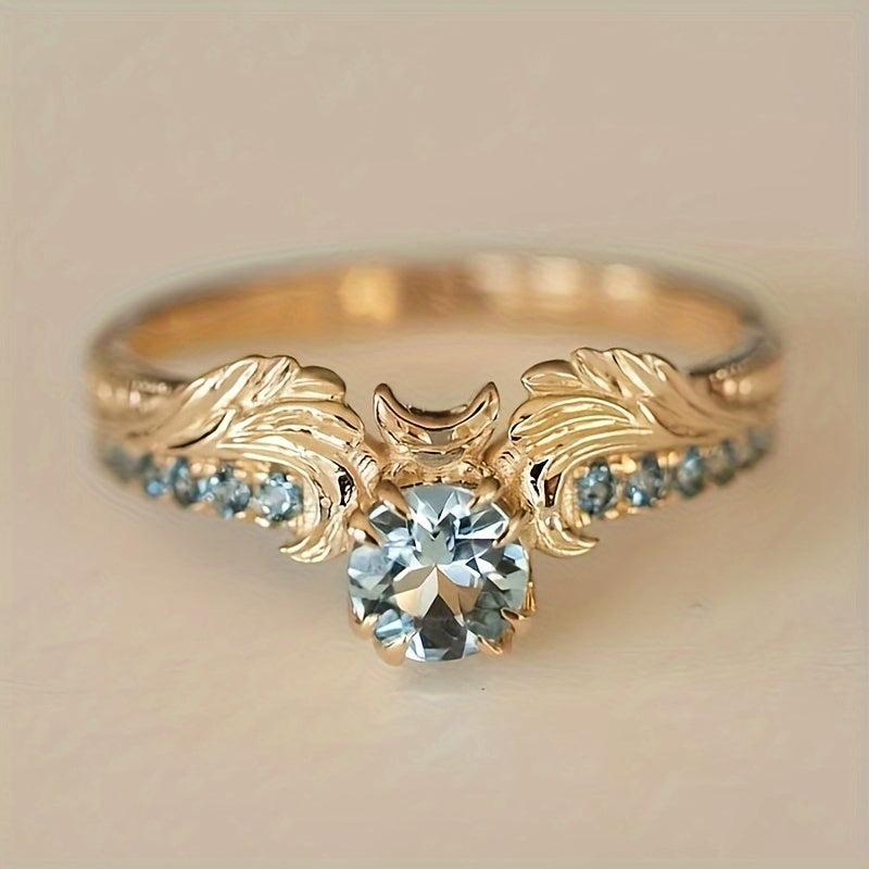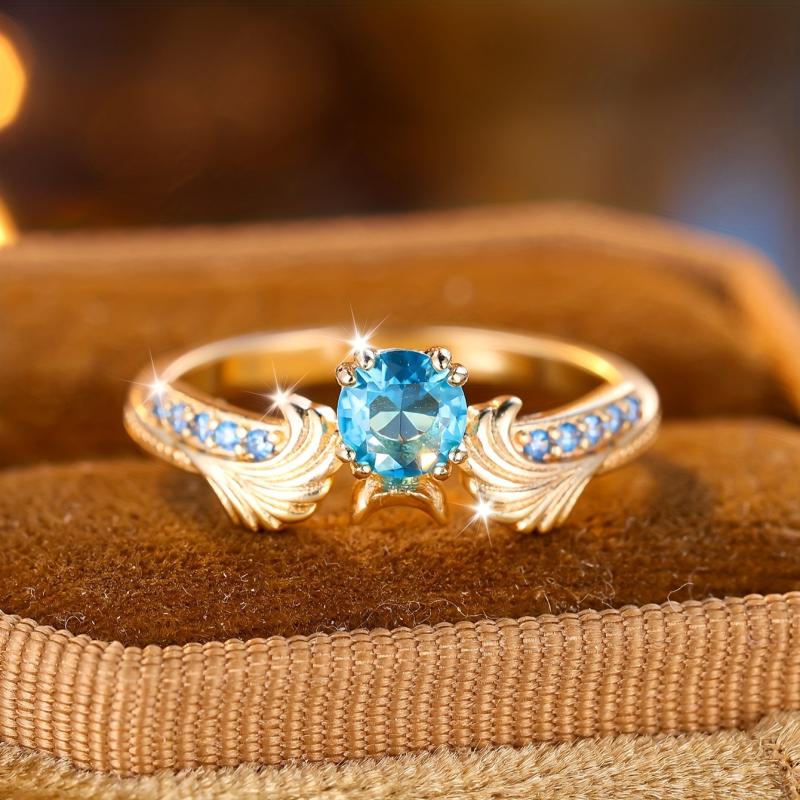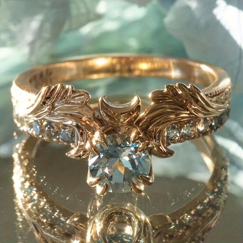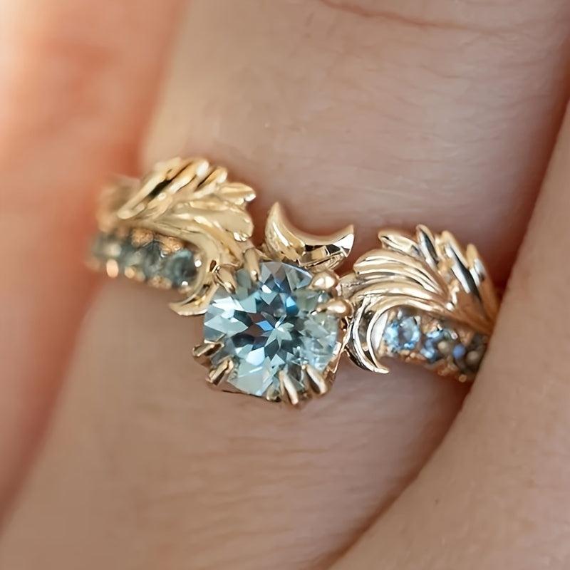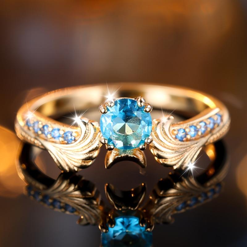 Elegant copper ring featuring a sea zirconia stone and intricate floral design, perfect for weddings and parties.