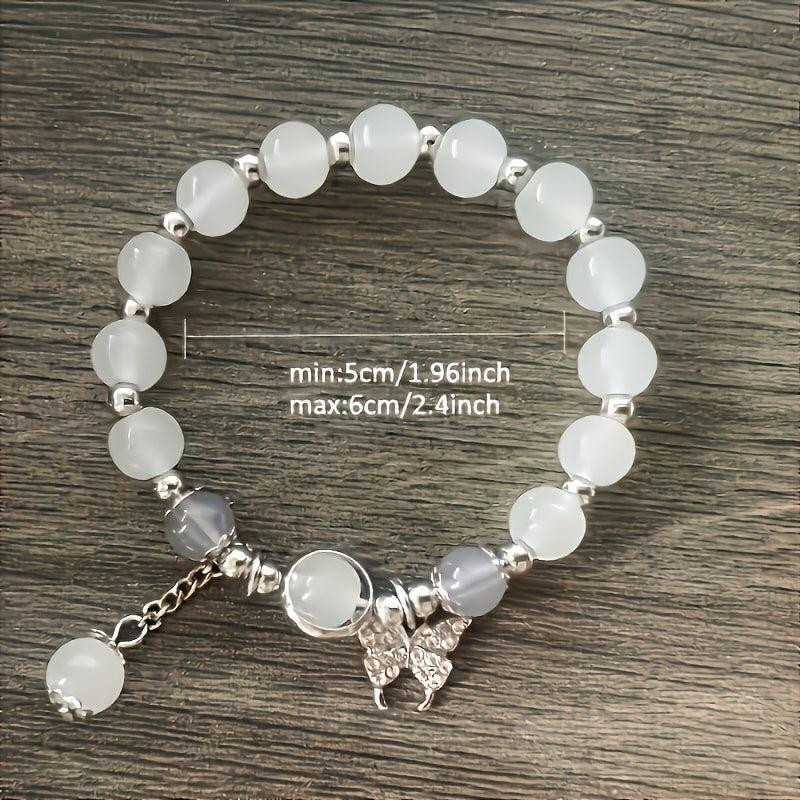 This bracelet features gray glass beads and cat eye stone charms, adorned with star and butterfly charms. It's perfect for daily wear or as a thoughtful gift.