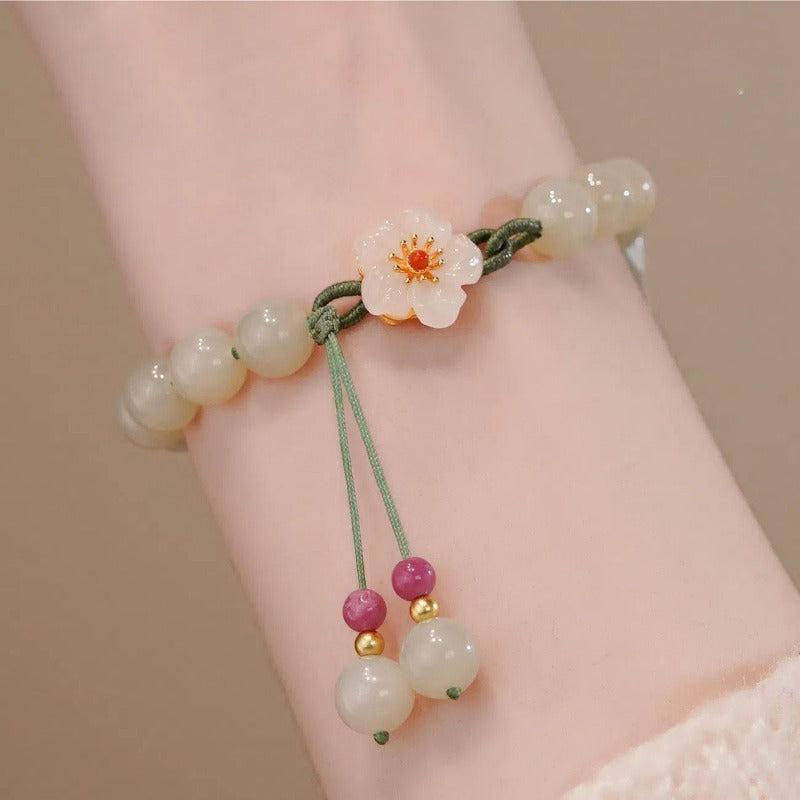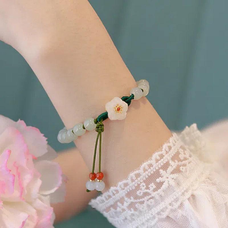 This beautiful bracelet features a light green peach blossom resin flower design on an adjustable woven cord. Perfect for adding a touch of boho style to your outfit.