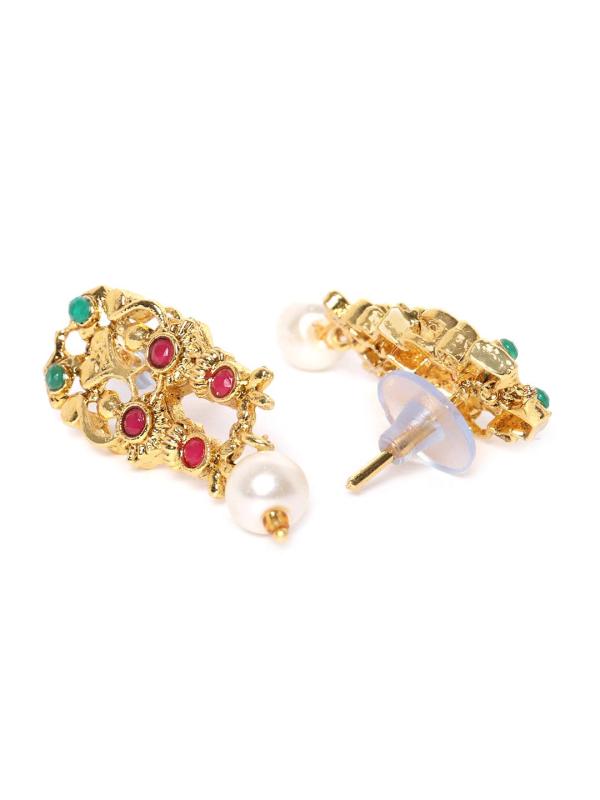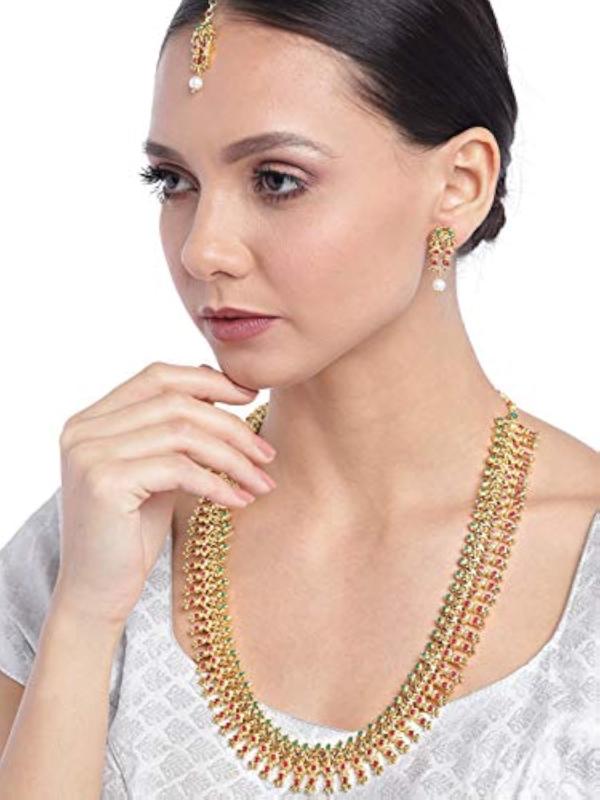 Enhance your ethnic look with this stunning traditional long necklace set. It includes earrings and maangtikka for a complete ensemble.