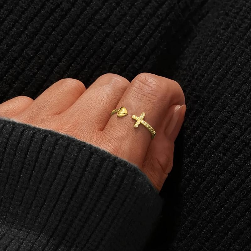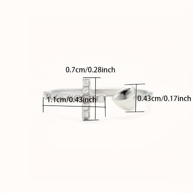 This minimalist promise ring features a heart and cross design adorned with synthetic zirconia stones. It is perfect for anniversary celebrations or casual attire.