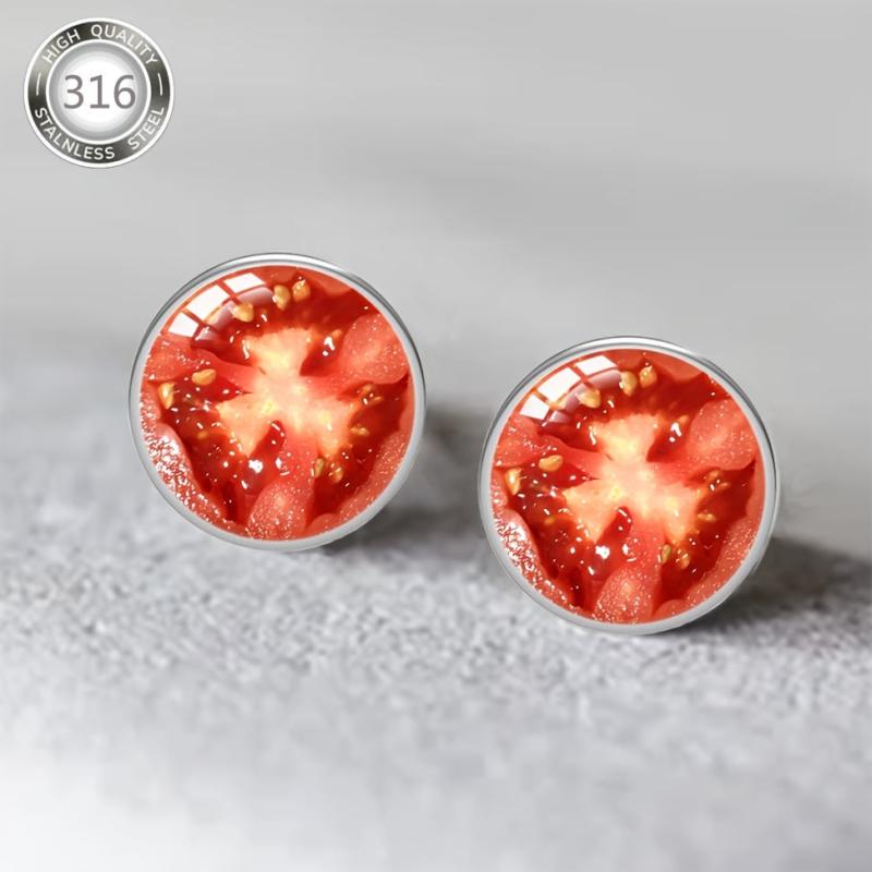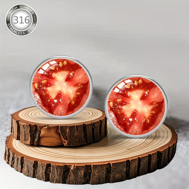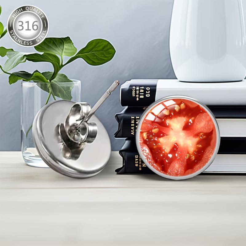 These earrings feature a fun design with tomato slice and star shaped glass studs encrusted in hypoallergenic 316 stainless steel. Durable and suitable for everyday wear, perfect for parties and events.