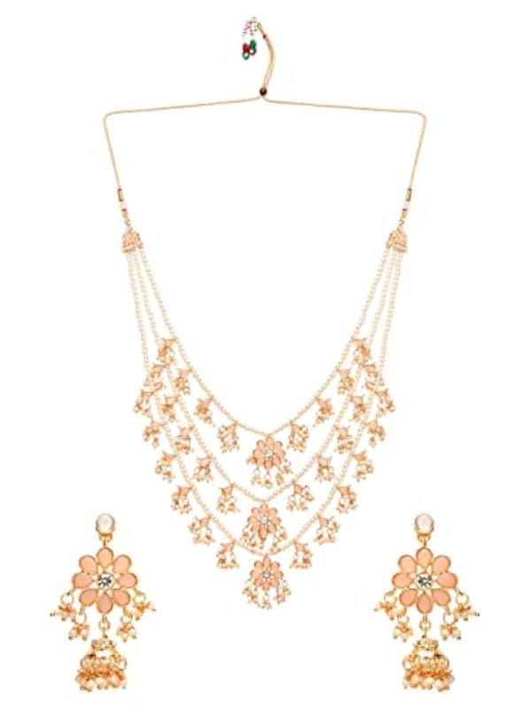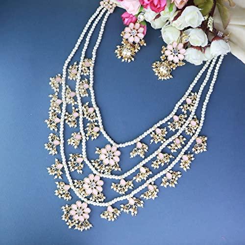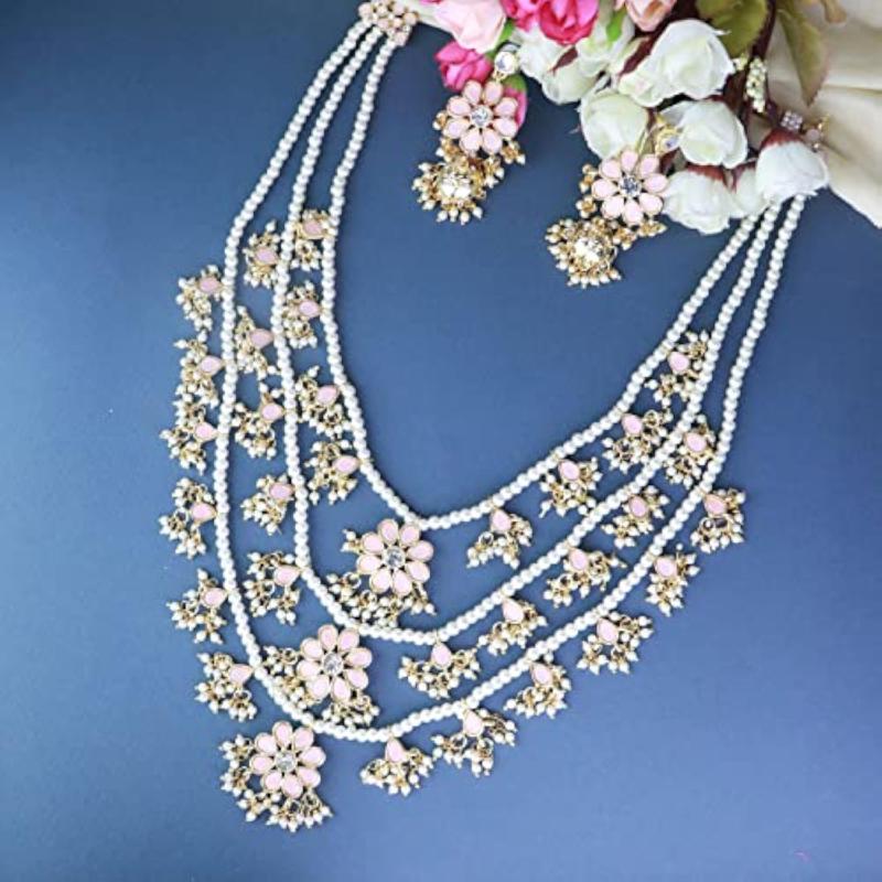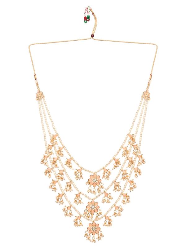 Elegant long necklace with floral kundan and pearl beads, perfect for weddings and special occasions.