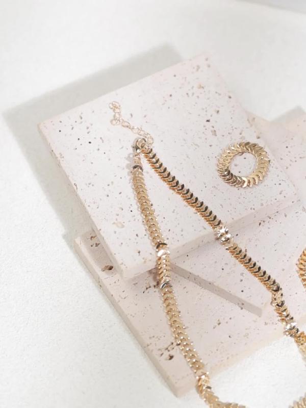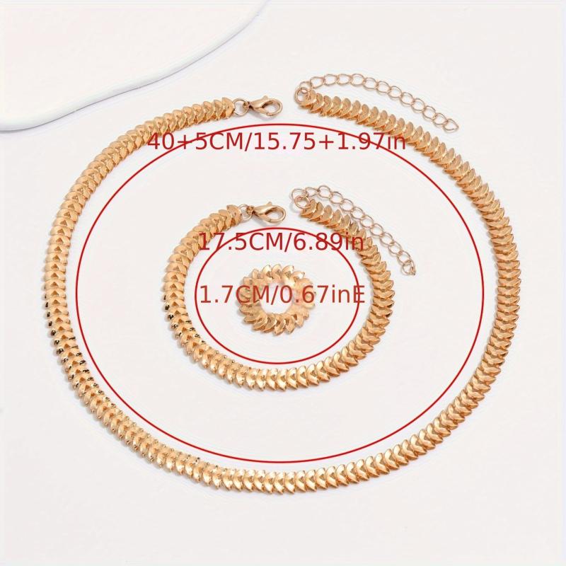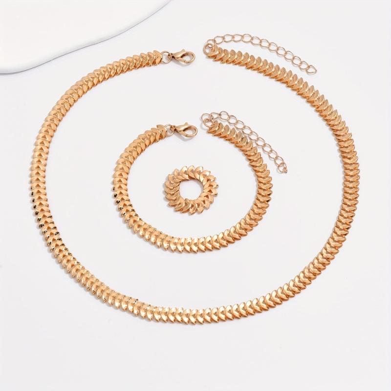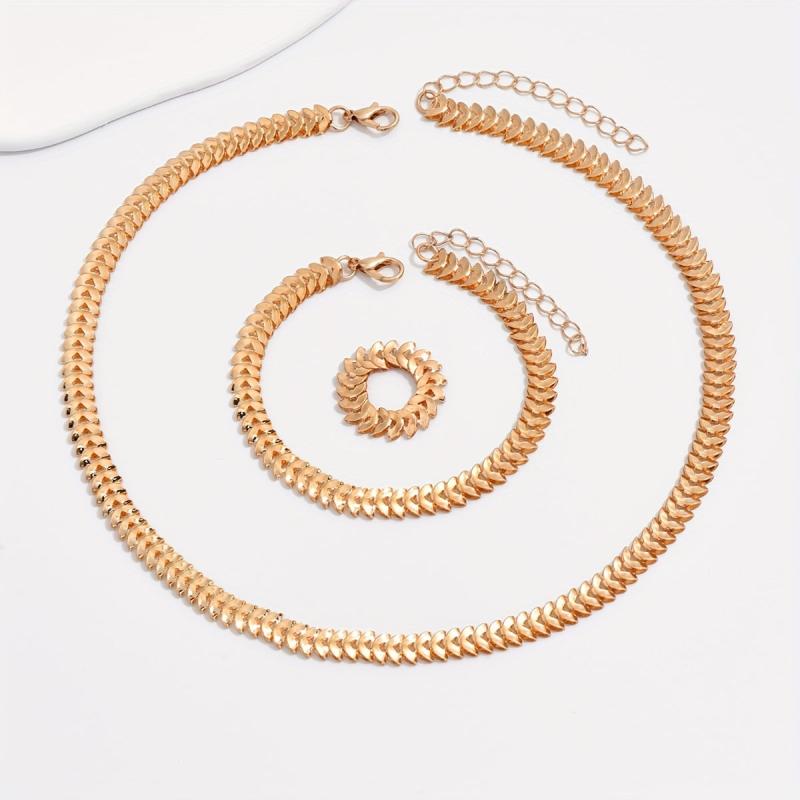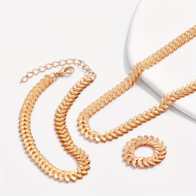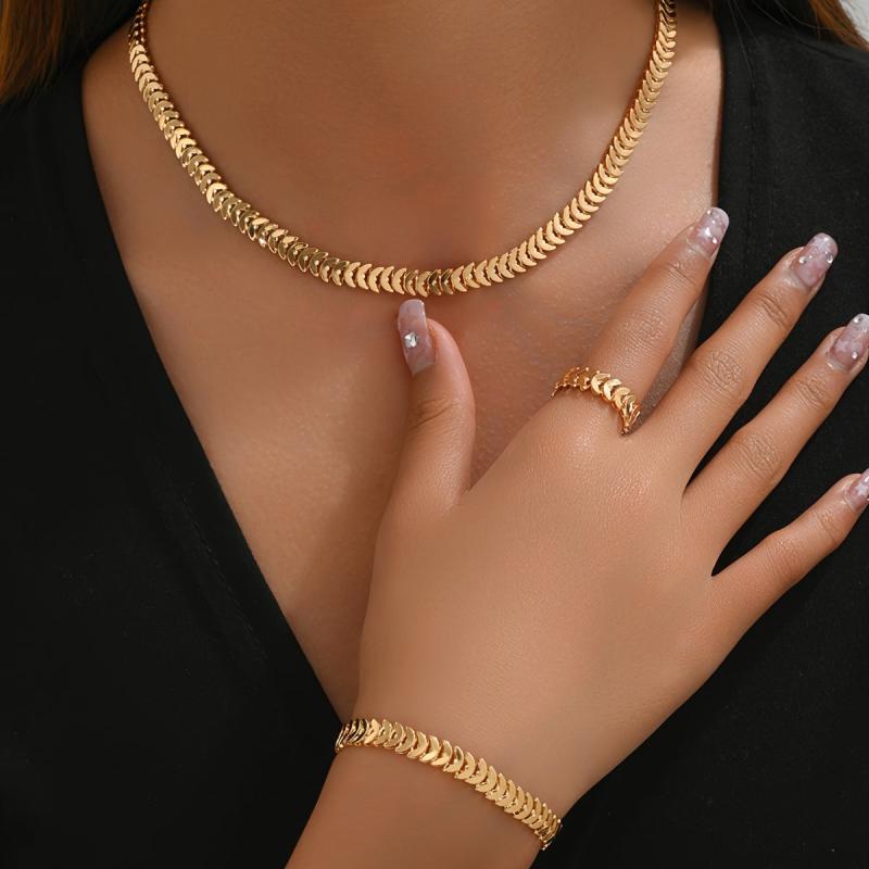 Elegantly simple leaf design jewelry set perfect for everyday casual wear. Includes a necklace, bracelet, and ring.