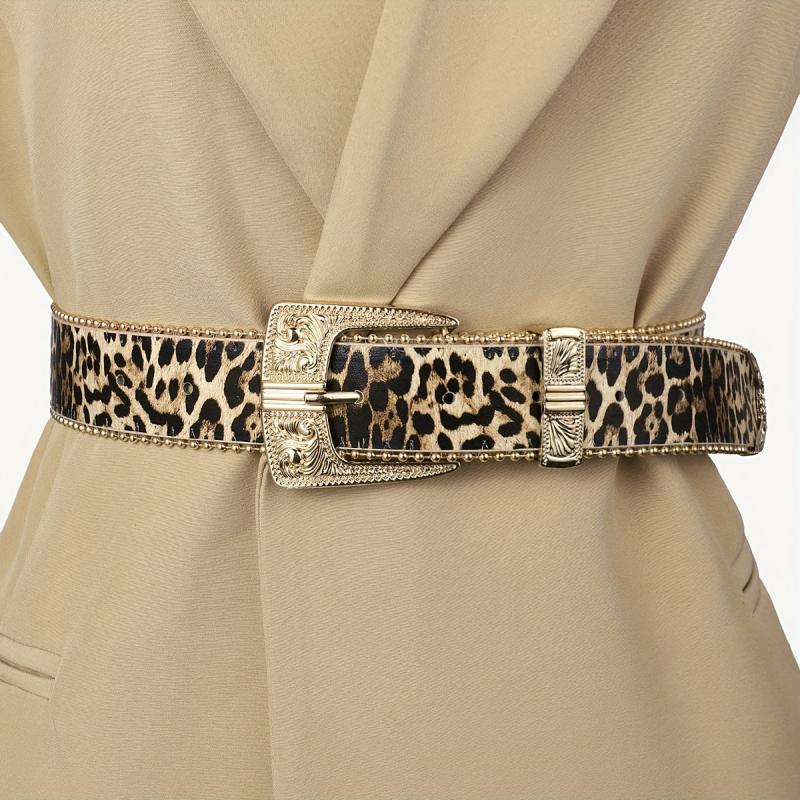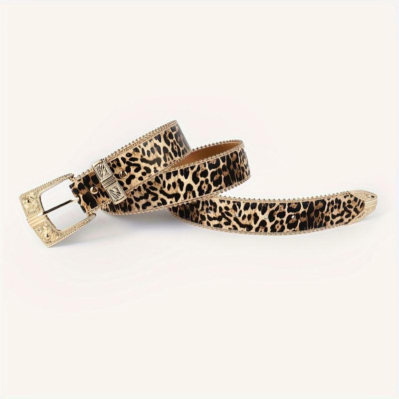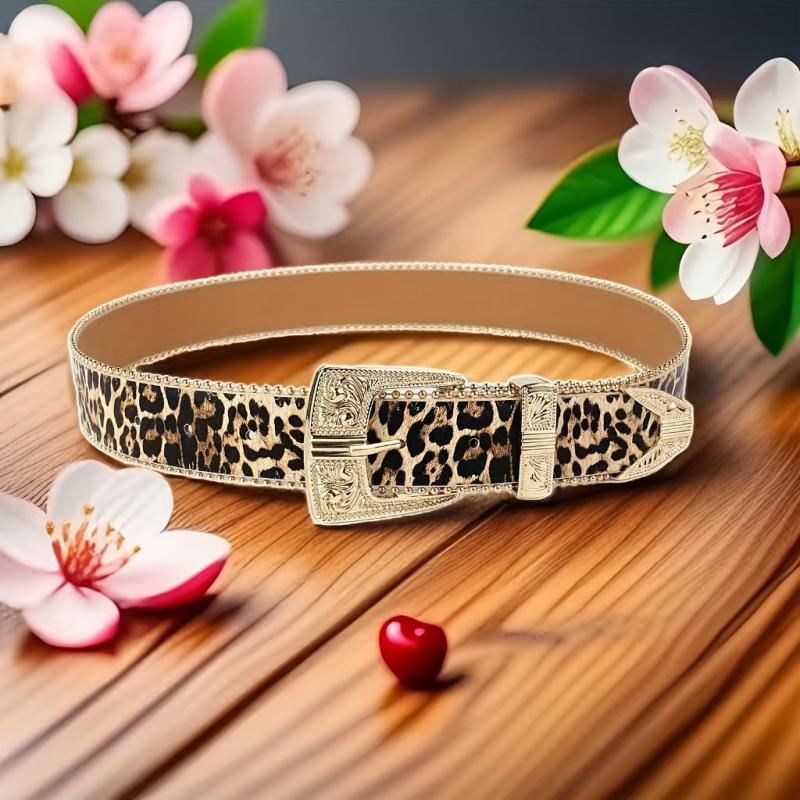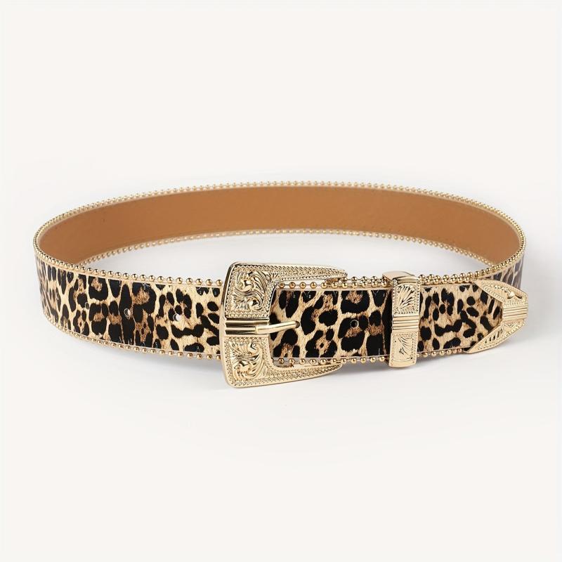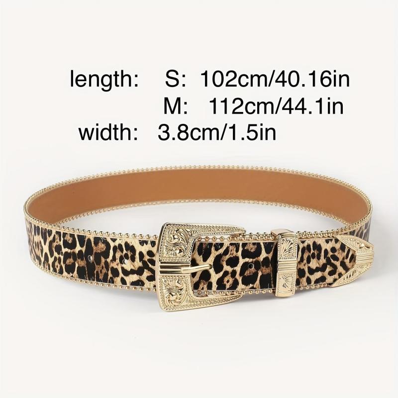 Add a touch of wild style to your outfits with this leopard print faux leather belt. The golden tone buckle and beaded edging add a touch of sophistication, making it perfect for evening dates or a day at the beach.