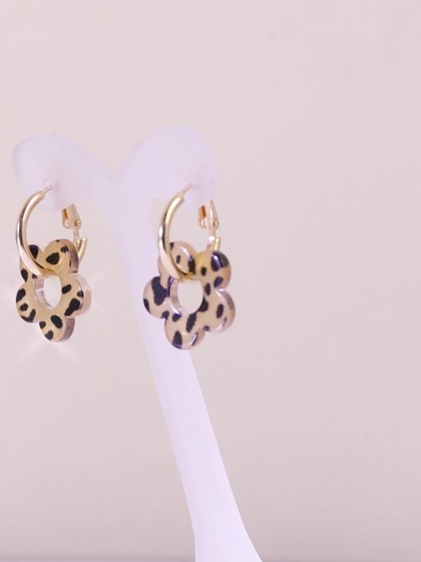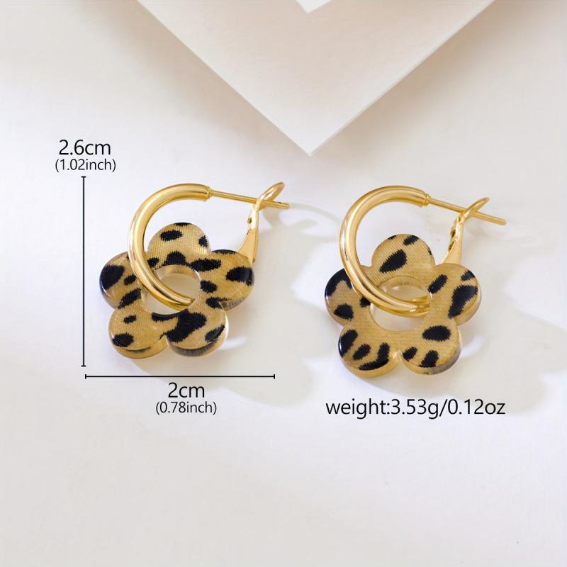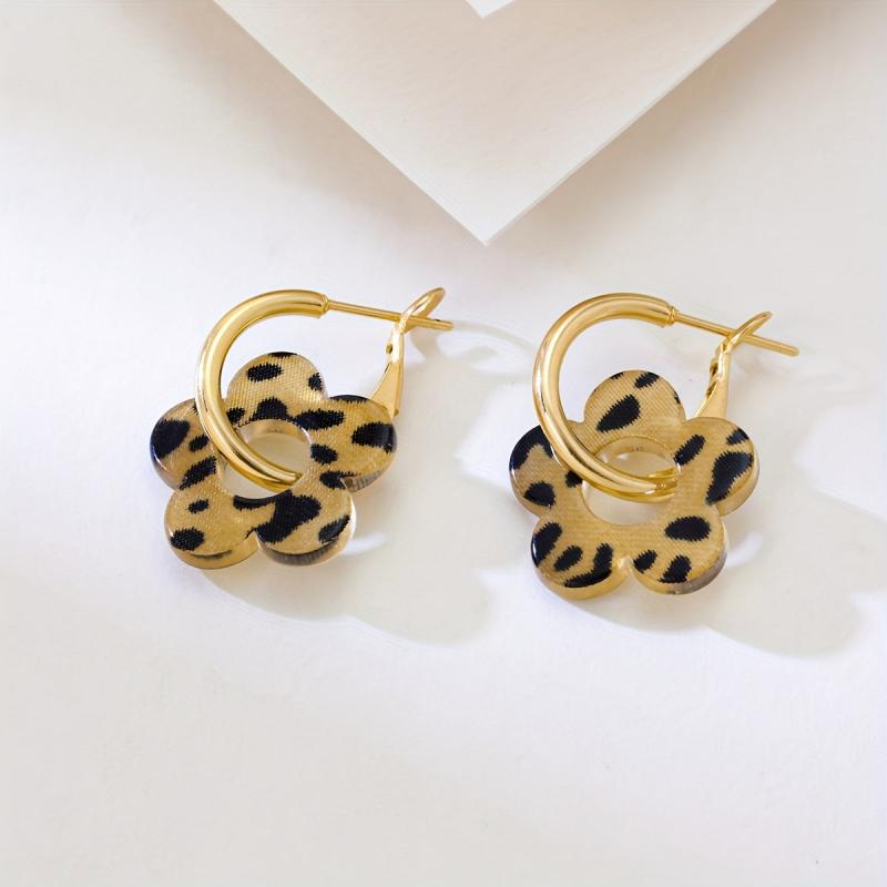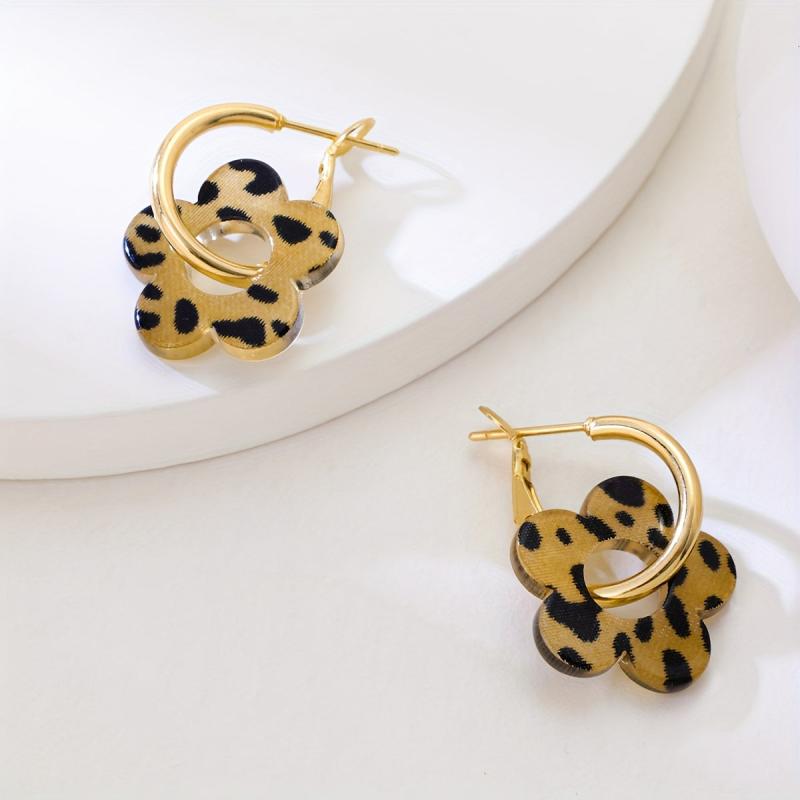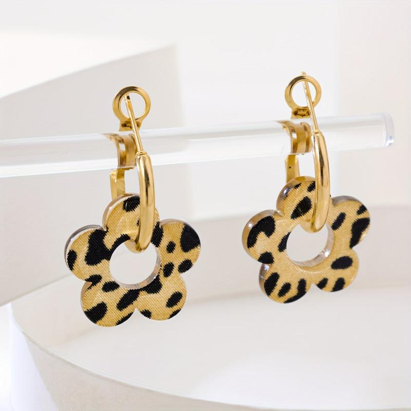 Add a touch of exotic flair to your look with these leopard print floral dangle earrings. Made with a golden tone, leopard print acrylic pendant, and stainless steel posts, these earrings are perfect for a boho-inspired style.