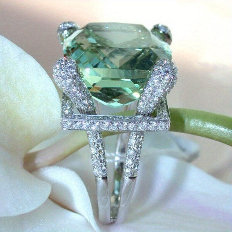 Elevate your style with this stunning light green cushion cut CZ zirconia cocktail ring. The micro pave set split shank design adds a touch of elegance, making it perfect for parties, weddings, or as a gift.