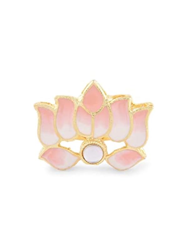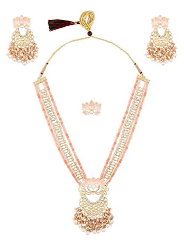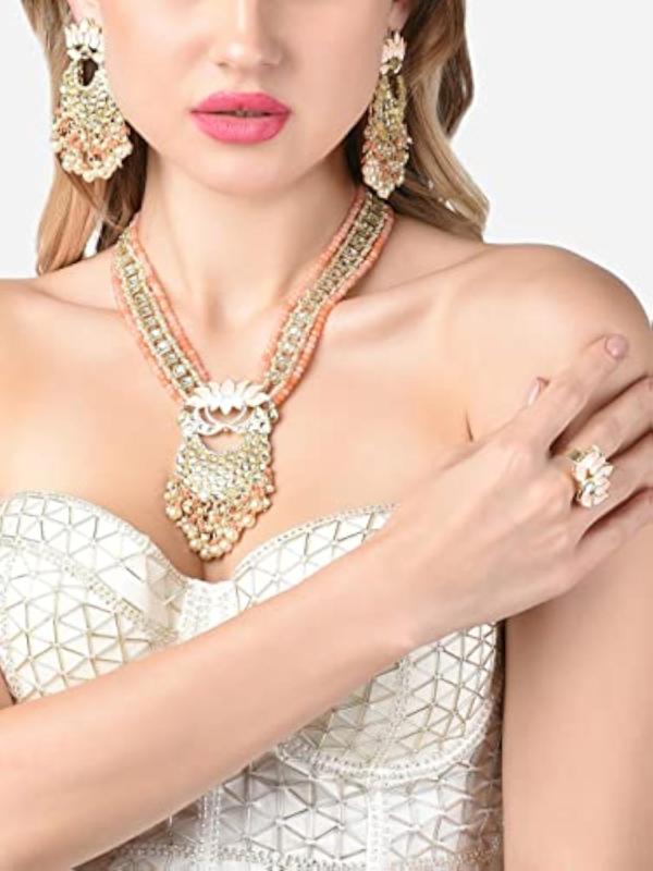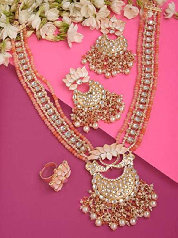 Exquisite Meenakari lotus design Kundan necklace, earring, and ring set perfect for brides. This stunning set will add a touch of elegance and traditional charm to your attire.